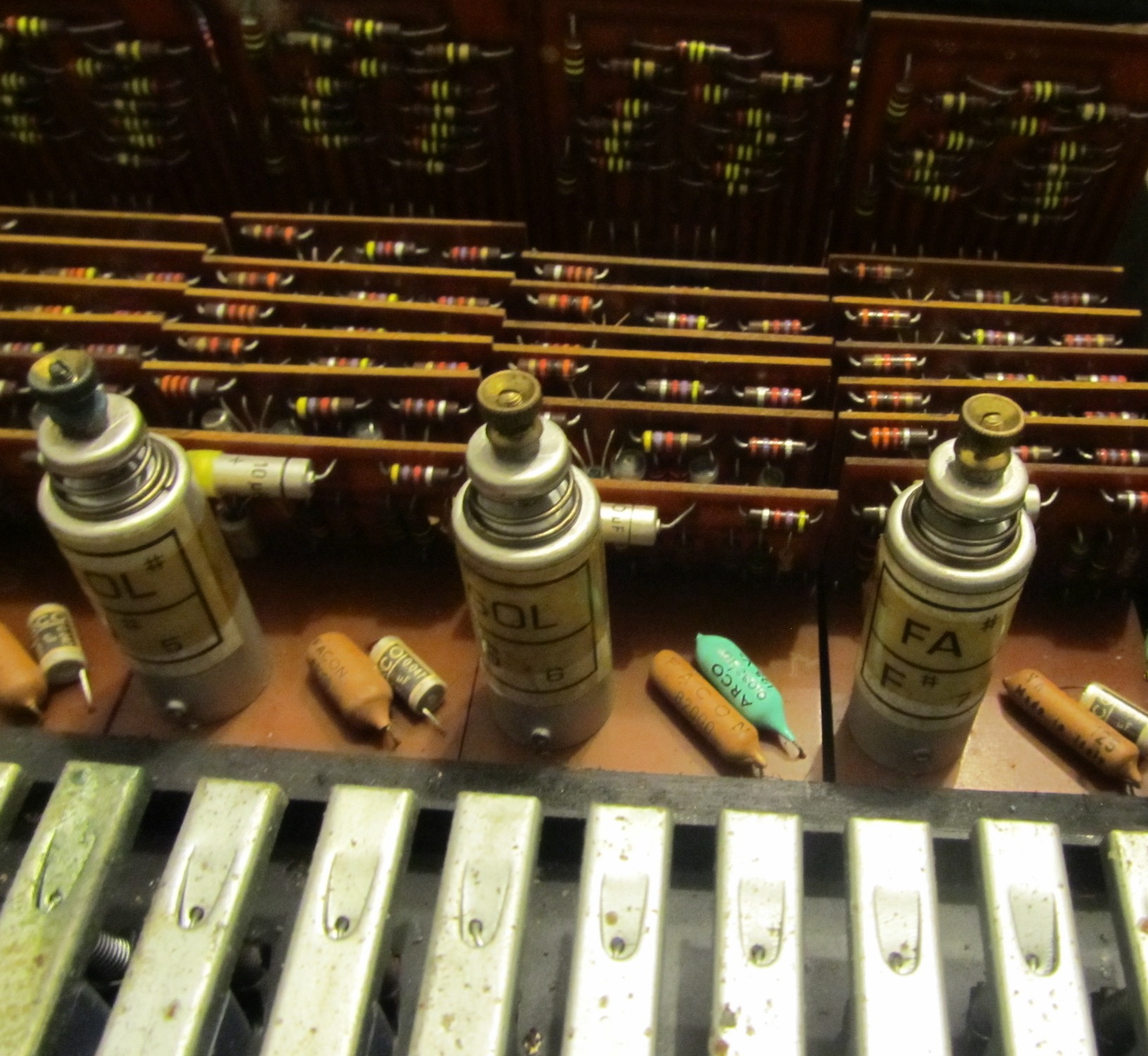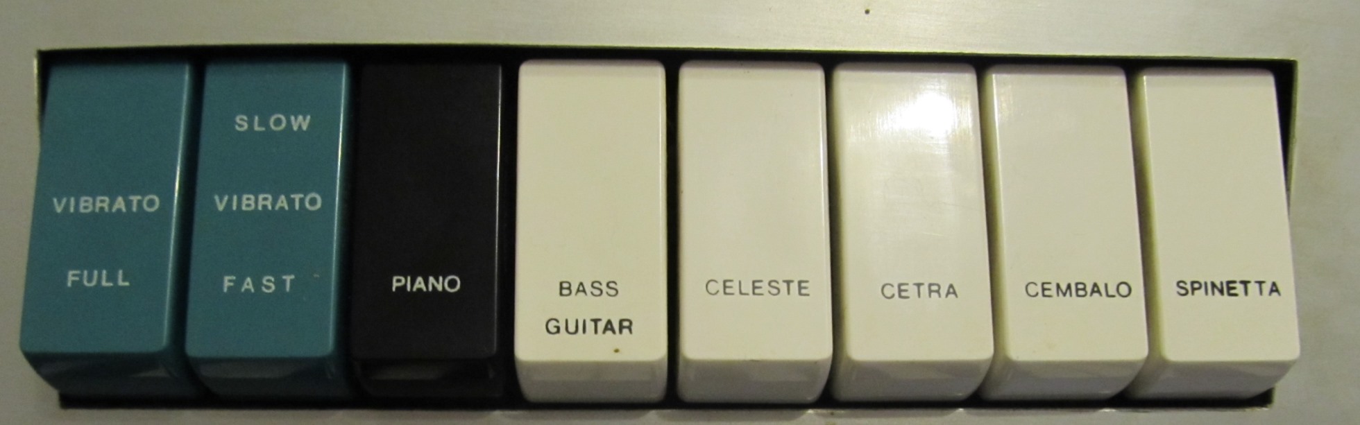 Vintage electronic piano Bauer-CEI Carnaval. maybe the first dynamic electronic organ in history. 6 (six!) octaves, Piano, Bass guitar, Celeste, Cetra, Harpsychord, Spinet. Very good looking but does NOT sounds. No legs or pedal. Could also be used as spare parts also for the Fender (Bauer) Starmaster. |