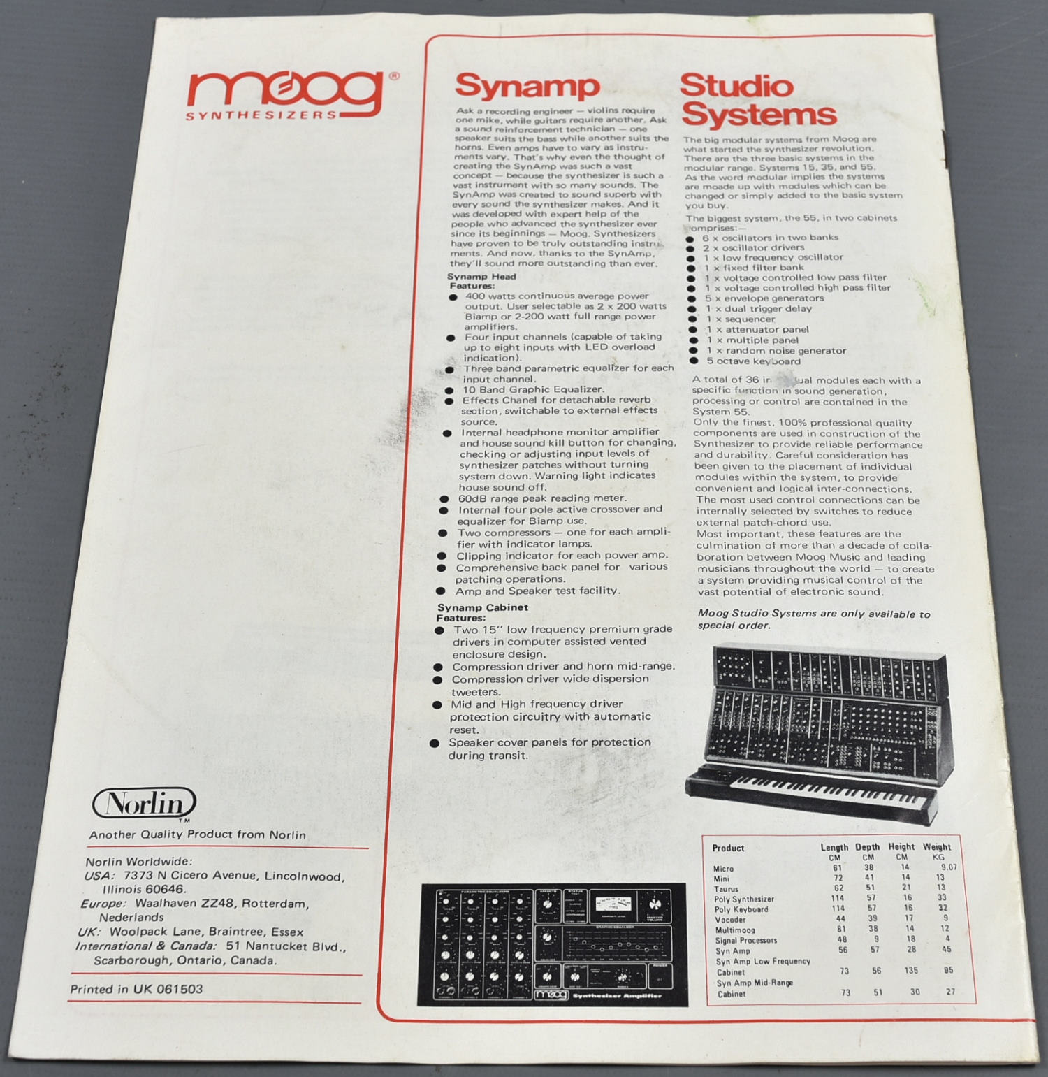 Vintage multi-page Moog brochure from the golden age, with caricatures of famous users on the front cover. Minimoog, Polymoogs, Taurus, System 55, Vocoder, Multimoog, Synamp etc.. In very good condition. Packing 1GBP. |