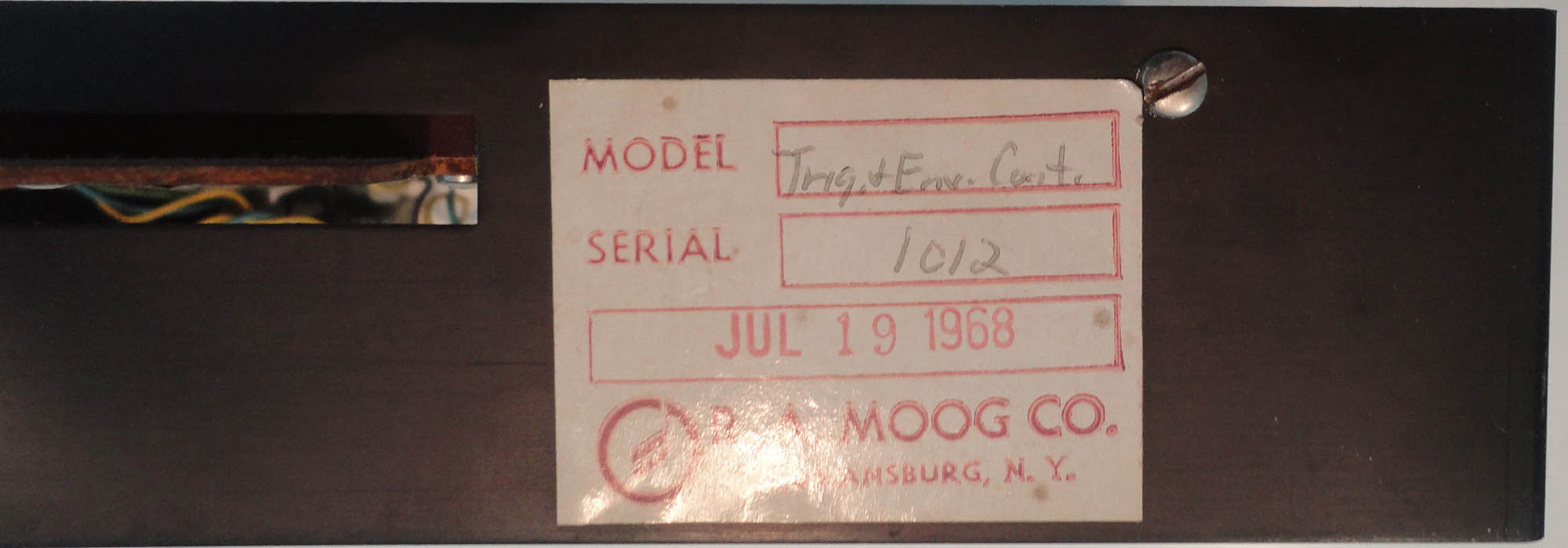 Rare early R.A. Moog module from July 19 1968, entered by Ed Buller. In very good condition except for what looks like some tape residue at the bottom of the front panel.