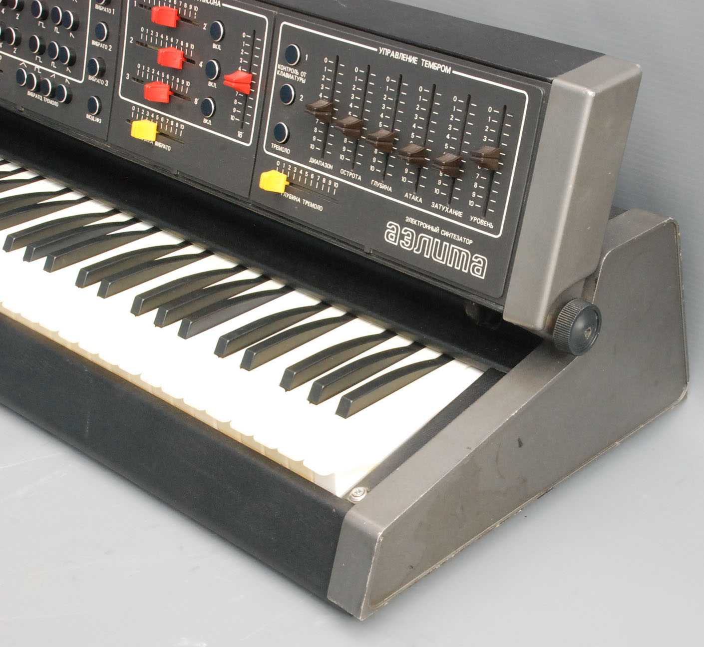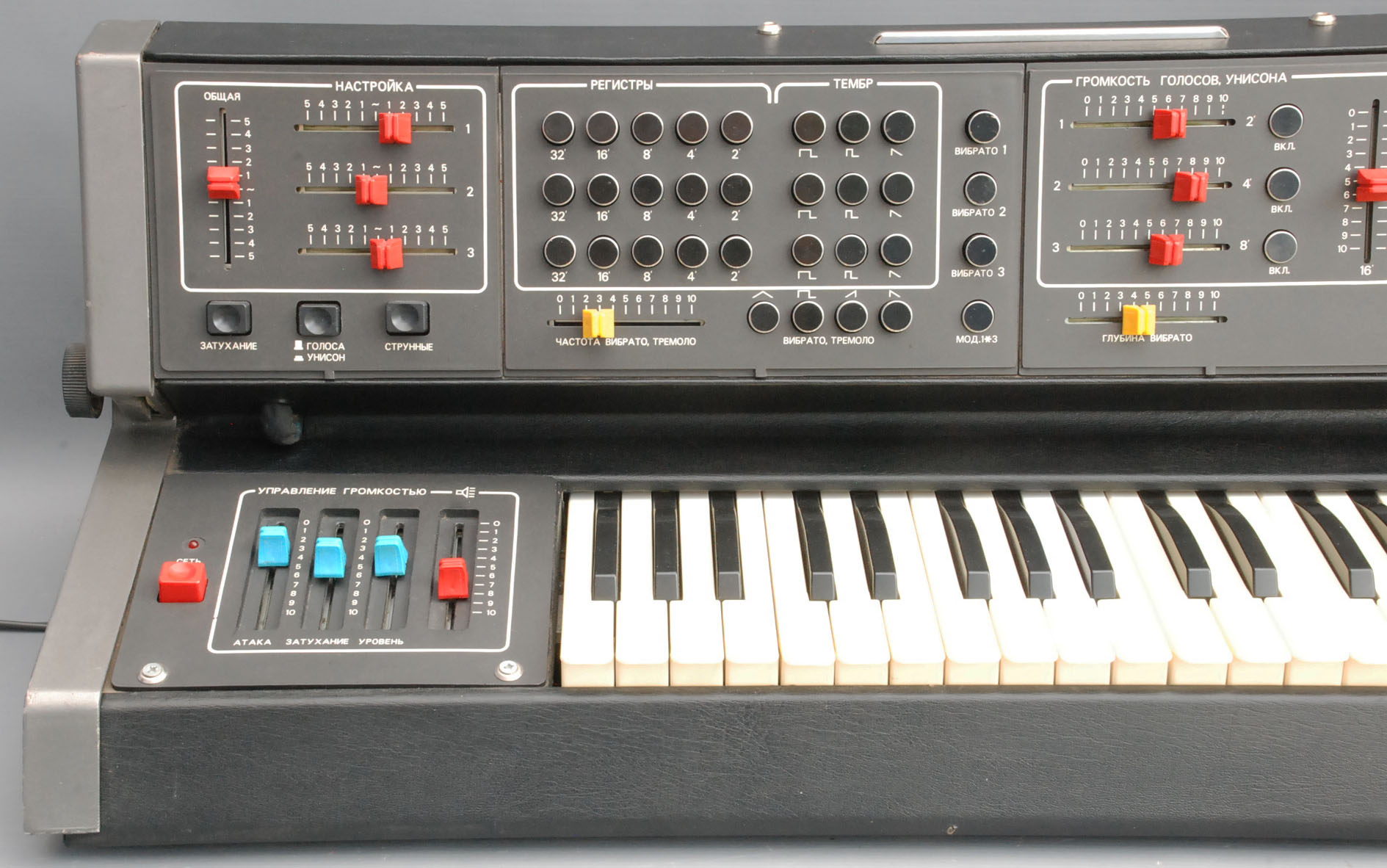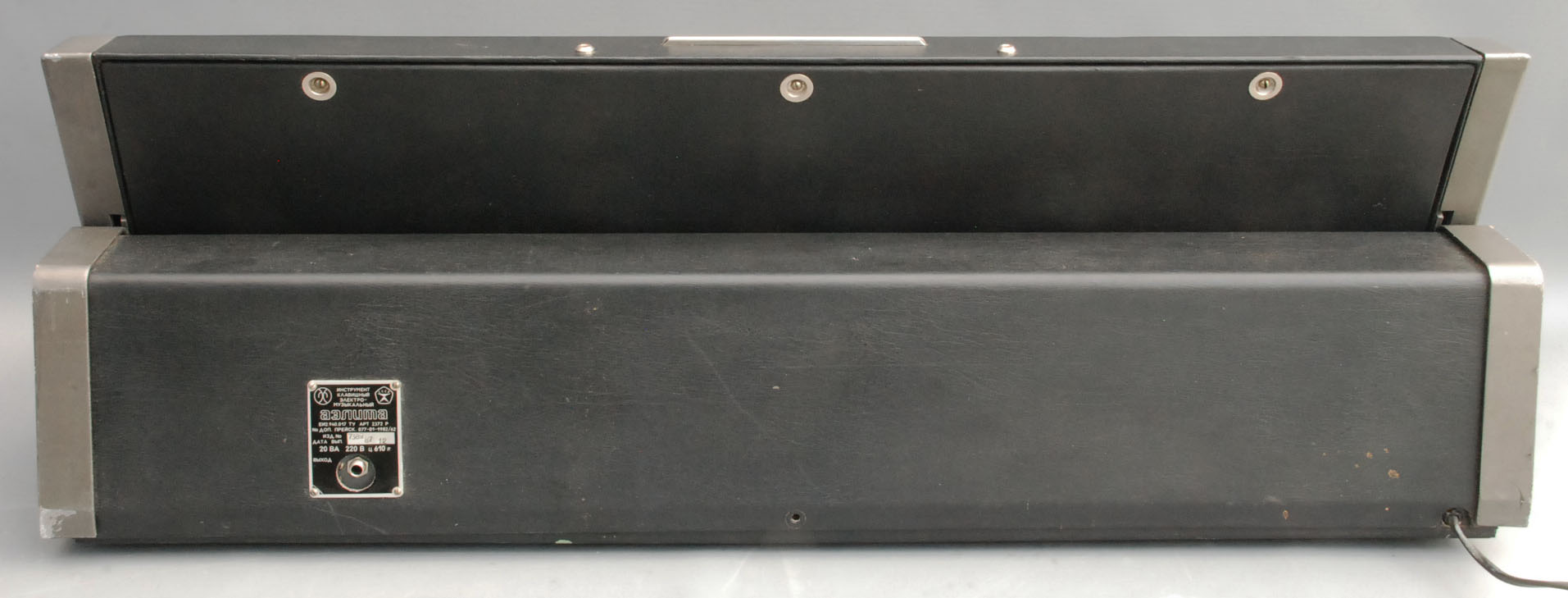 This is really the Soviet Minimoog - with some minusses, of course, but also some plusses. The filter emphasis is much harsher, and the envelopes aren't as well designed, we reckon - but the basic three-oscillator sound and filter in non-resonant mode is a Minimoog rival in every way. The overall cosmetic design is tacky compared with a Mini, but is still solid, and, on this machine, looks all-original. Where it honestly outscores the Mini is in its extras - 'strings' mode, which seems to put a different chorus on each of the footages, unison, and the way you can switch easily between two or three very different sound textures. High-note keyboard priority, great for holding down a bass note and doing stuff over the top - the dedicated LFO comes in useful here too for sequencer-like riffing. Checked by nLi April 14 and still in good working order today.