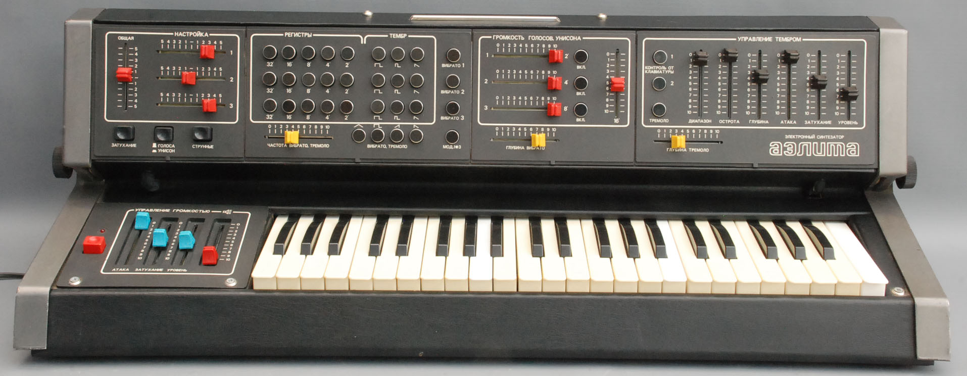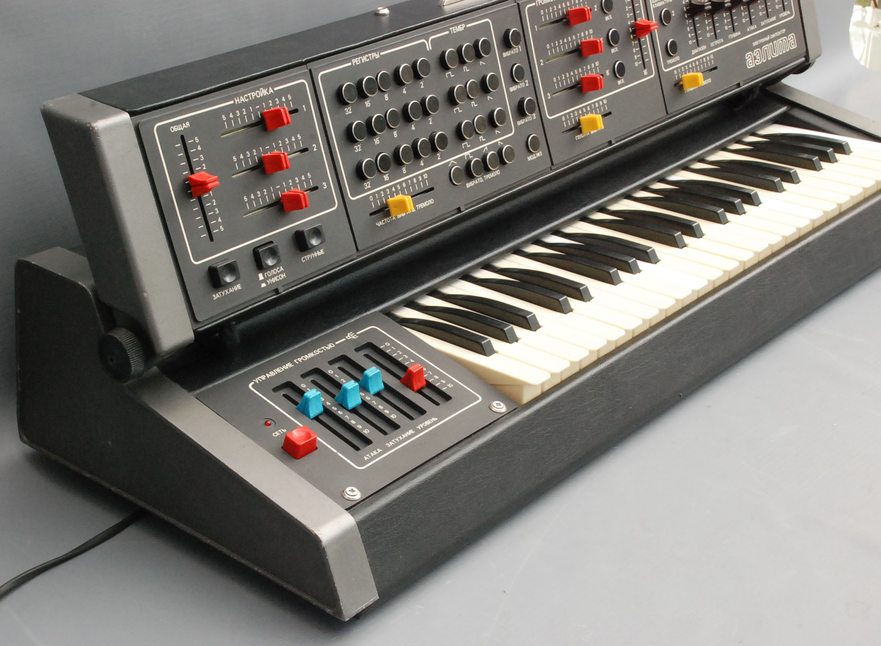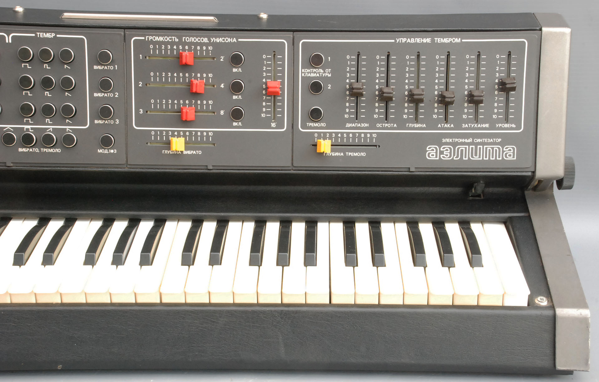 This is really the Soviet Minimoog - with some minusses, of course, but also some plusses. The filter emphasis is much harsher, and the envelopes aren't as well designed, we reckon - but the basic three-oscillator sound and filter in non-resonant mode is a Minimoog rival in every way. The overall cosmetic design is tacky compared with a Mini, but is still solid, and, on this machine, looks all-original. Where it honestly outscores the Mini is in its extras - 'strings' mode, which seems to put a different chorus on each of the footages, unison, and the way you can switch easily between two or three very different sound textures. High-note keyboard priority, great for holding down a bass note and doing stuff over the top - the dedicated LFO comes in useful here too for sequencer-like riffing. Checked by nLi April 14 and still in good working order today.