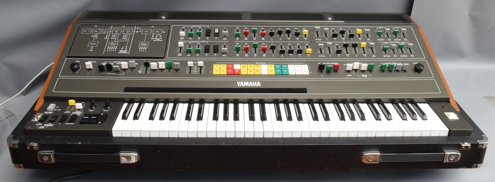 This is a lovely example. It has its original stand, wheels and lid, and has had Kenton MIDI professionally retro-fitted. There are a few minor dings on the panel (very minor) - and there is a crack at the bottom right edge of the programmer well - see pic - plus a small (10x5cm?) bit of tolex missing from the bottom, and the lid and case are showing their age - but the overall feel and look is beautiful.