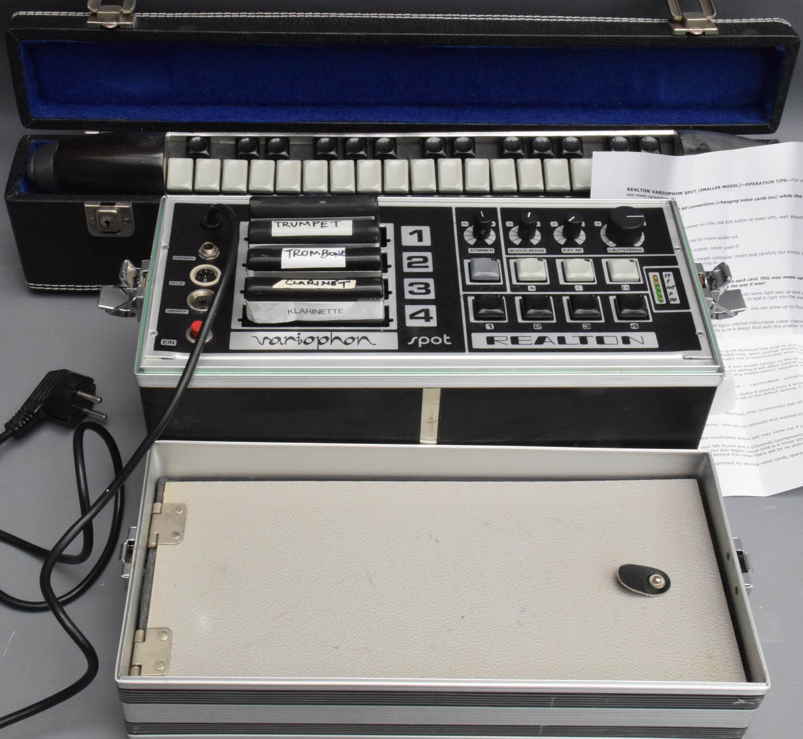 It comes with a useful info sheet from a previous owner. The wind controller looks like it was silver-painted at some stage, but otherwise the whole thing is in excellent cosmetic condition. It comes with a new unused mouthpiece. (You may need to put it in hot water first to make it easy to attach.) The one design fault is that it seems impossible to close the main unit case safely with the existing Euro plug on the mains lead, so for transit we will cut the lead ready for you to get your own UK or Euro plug fitted to it. Packing 5GBP.