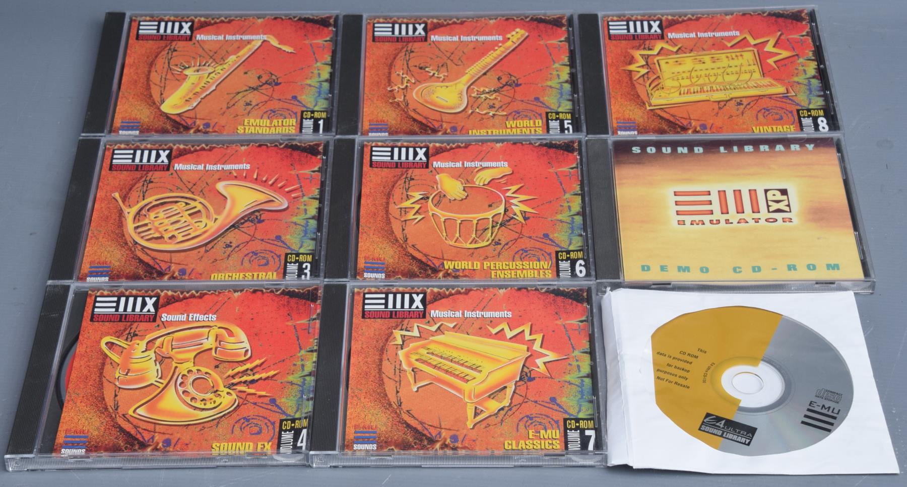 A nice set of seven EIIIX sample CD-ROMs, 1, 3, 4, 5, 6, 7, 8 - just missing CD-ROM 2, plus an Emu IIIXP demo CD-ROM and an E4 Ultra Sound Library disk. Near mint. Packing 2GBP. |