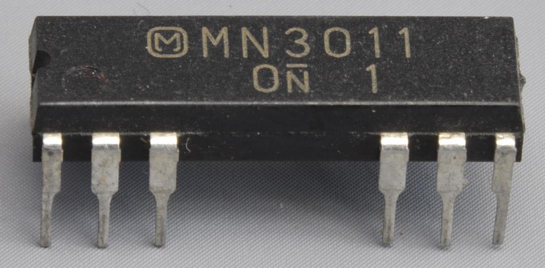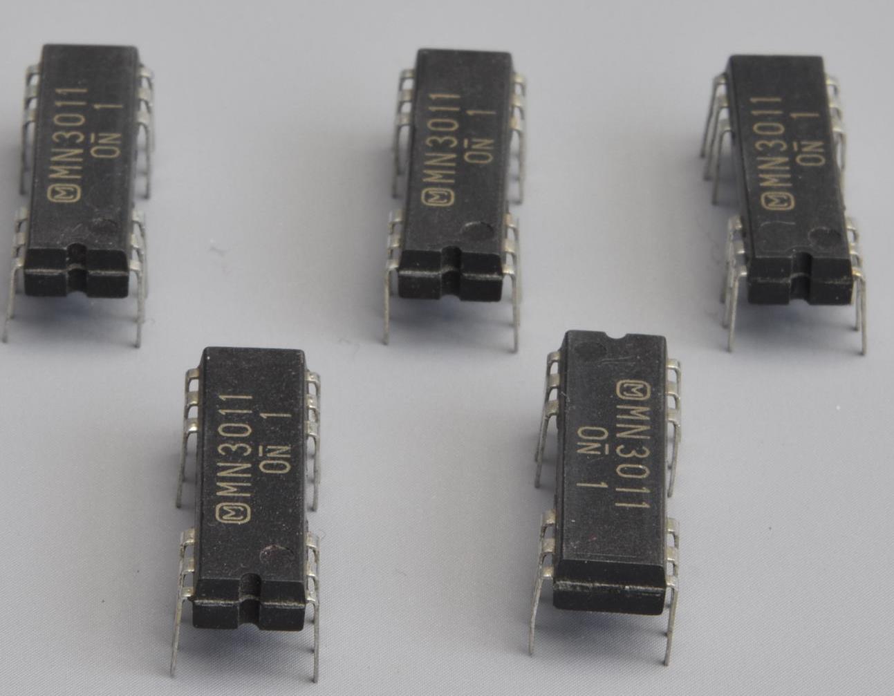 Five unused MN3011 BBD (bucket brigade delay) chips from Analogue Systems' stock. This type of chip was used in the RS-310 and has a distinctive sound. |