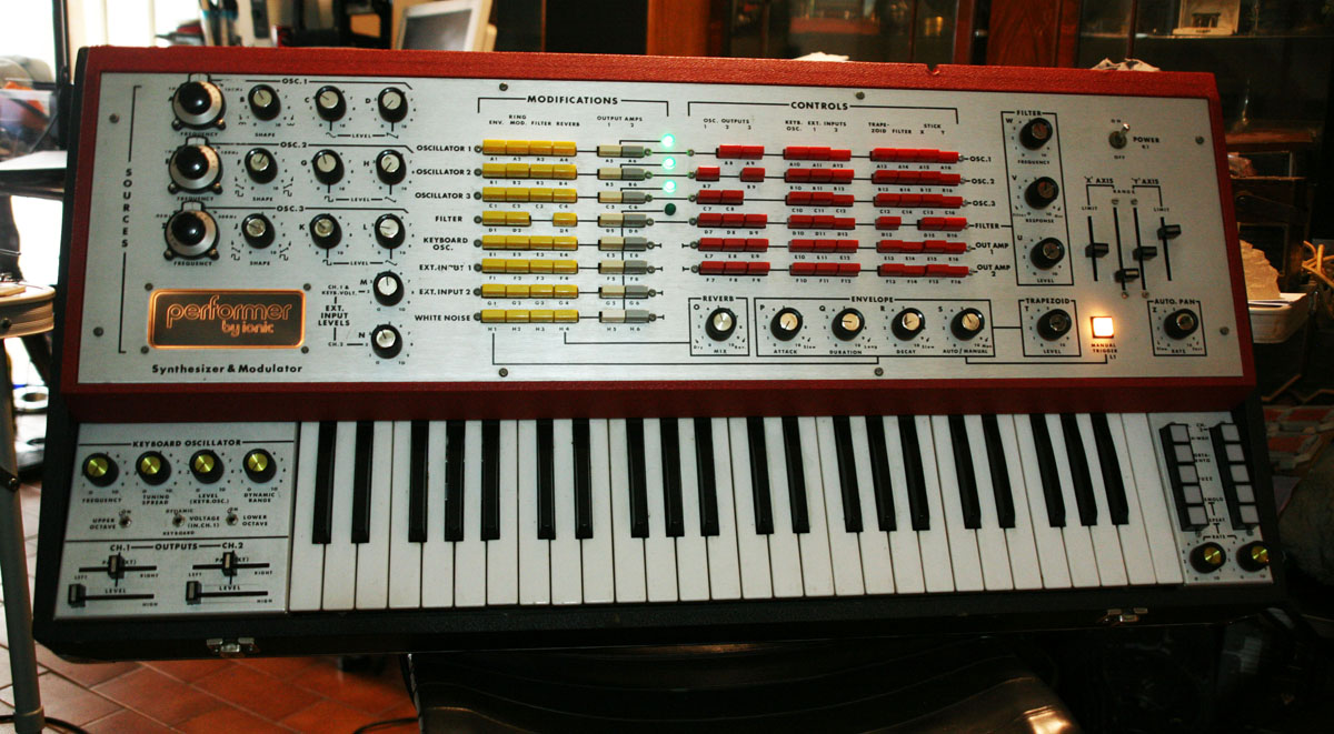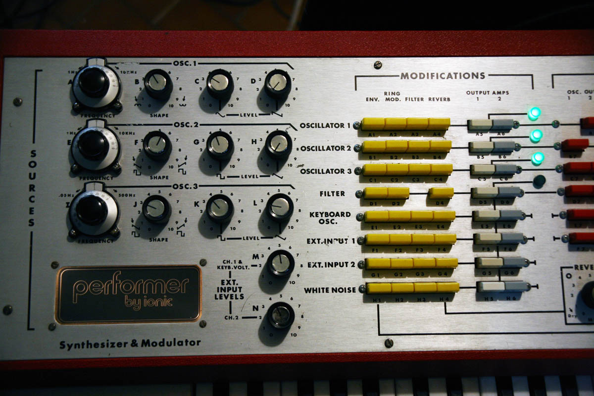 Rare Ionic Performer Synthesiser and Modulator produced in 1973. Basically similar to a VCS3 + Putney keyboard but uses a series of pushbuttons, instead of patch pins, to route sounds and voltages. It's capable of producing some very complex sounds but definitely requires work from a good synth tech to get its full potential.