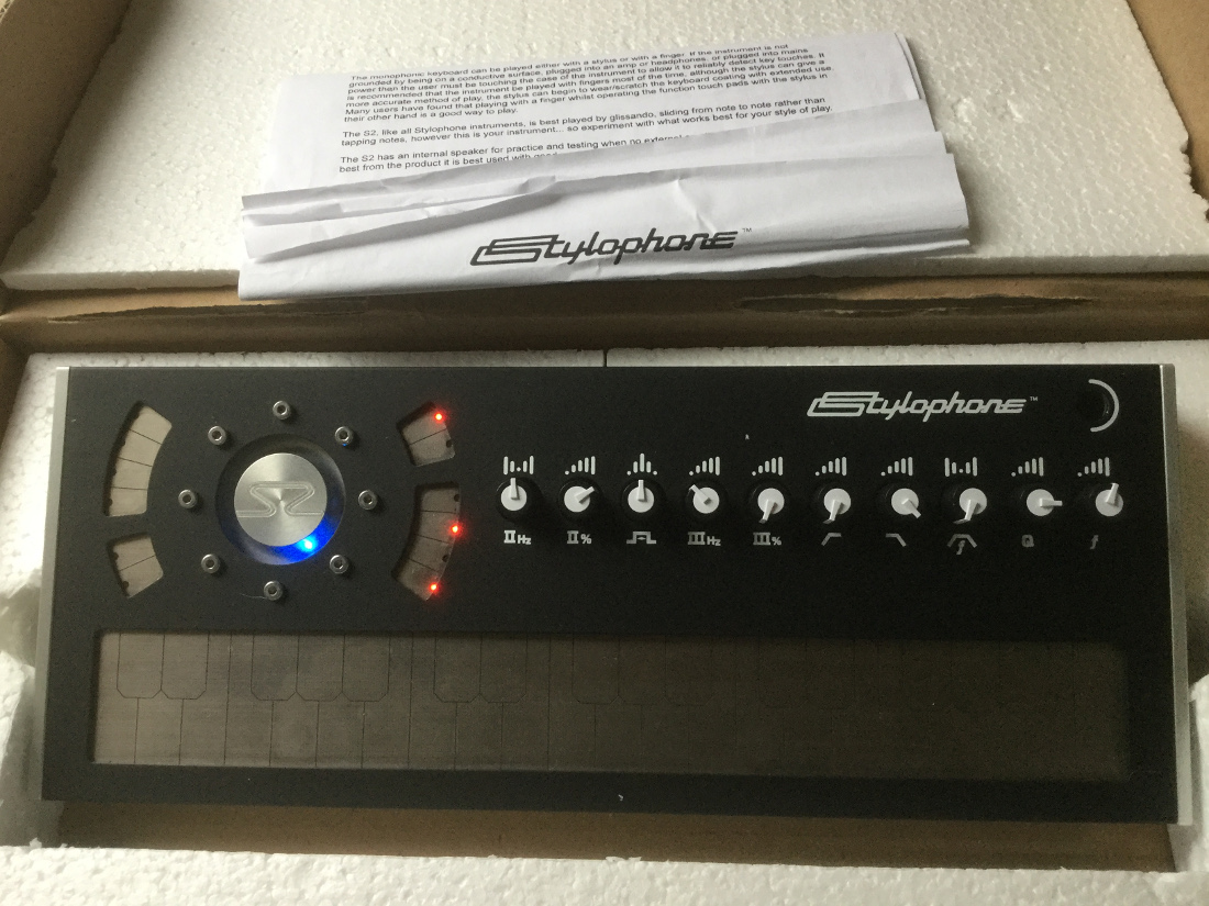 As new in original packaging, with instruction sheet(s). An interesting and unusual take on the original Stylophone crossed with a full blown synth. 2 VCOs, LFO, VCF and envelopes. LFO goes up to low audio. Various functions are on the touch pads that vary octave, wave shape combinations LFO set up, ring mod and tuning modes (all explained in the included instructions). Can be played with the included stylus (there is a storage compartment underneath) or with fingers. |