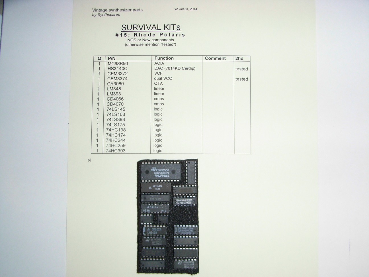 Note : THE HS3140/MP7614 IS NO LONGER INCLUDED IN THE KIT !!! pict not updated, sorry ___ *** Survival kit for Rhode Chroma Polaris *** from synthspares (kit N°15) integrated Circuits useful to service your instrument ___ ACIA (MC68B50), VCO (CEM3374), VCF (CEM3372), OTA (CA3080), TTL 'LS' logic gates, CMOS 'CD' and 'HCMOS'' logic gates, linear ICs and more ___ICs are brand new / NOS / 2nd hand tested ___See pict for detail ___Shipment tracked & insured