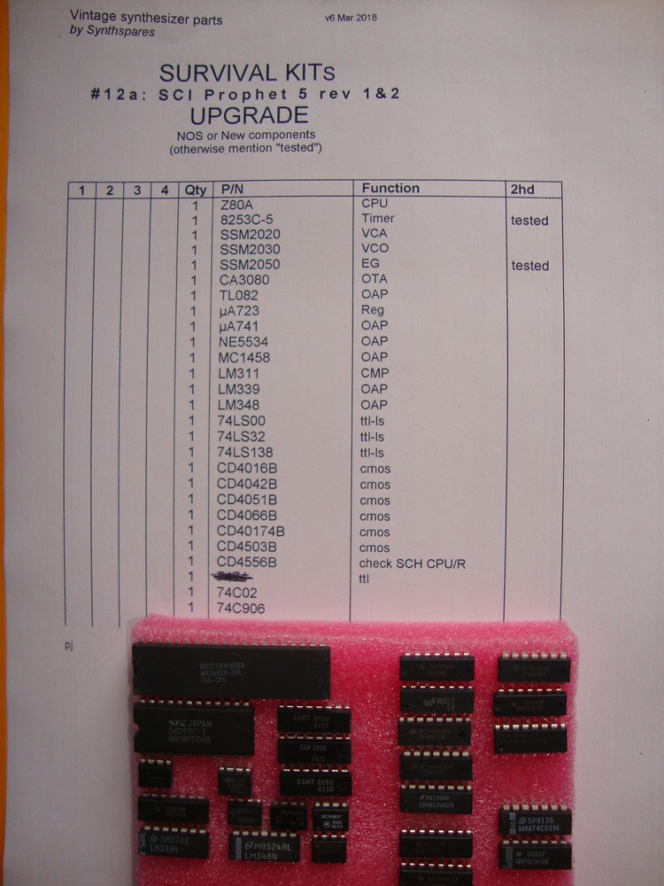 *** Survival kit for SCI Prophet 5 rev 1/2*** from synthspares (kit N° 12a) Plenty of Integrated Circuits useful to service your instrument ___ VCA: SSM2020, VCO: SSM2030, EG: SSM2050, CPU, TTL, CMOS, Linear ICs and more ___ ICs are brand new / NOS / 2nd hand tested ___ See pict for detail ___ The date code can be different from those of the photos ___ Shipment tracked & insured