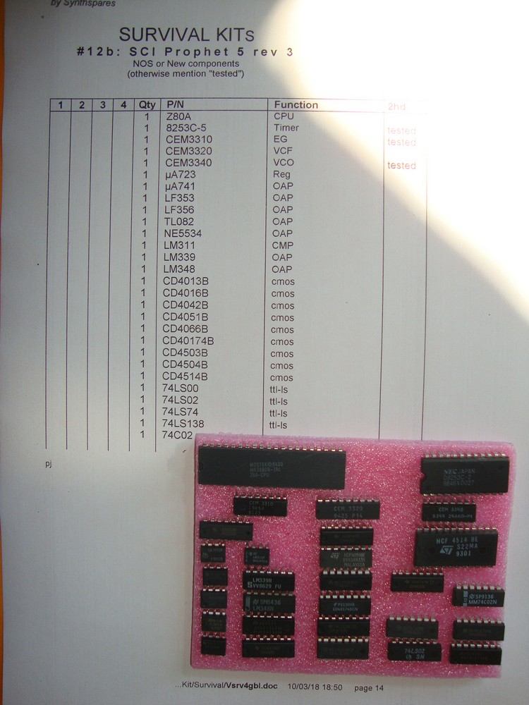 *** SRV kit PROPHET 5 rev3 (3340-G) *** from synthspares (kit N° 12c) )___ kit delivered with the brand new CEM3340 revG instead of the 2nd hand old CEM3340 (in contrary with the photos of the kit) ___ 29 Integrated Circuits useful to service your instrument like VCO: CEM3340 rev G, VCF: CEM3320, EG: CEM3310, CPU, Per, Mem, TTL, CMOS, Linear ICs and more ___ICs are brand new / NOS / 2nd hand tested : CEM3310 : 2nd hd tested, CEM3320 : beautyfull NOS, CEM3340 : new revG ___ The shipment is tracked & insured ___ The date code can be different from those of the photos