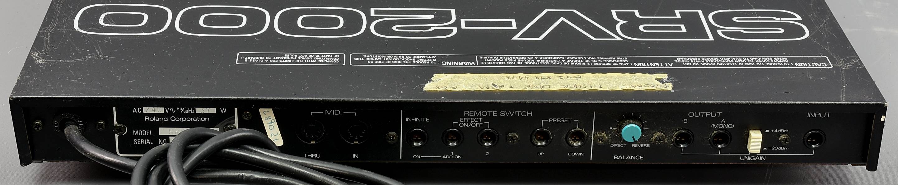 This vintage Roland reverb from Genesis / Tony Banks is a bit messy, has tape over the Bypass switch, some wear on some buttons, and the display doesn't seem to work. Otherwise un-tested, so **sold as seen**. UK/Euro flying lead with IEC female socket. Packing 6GBP. |