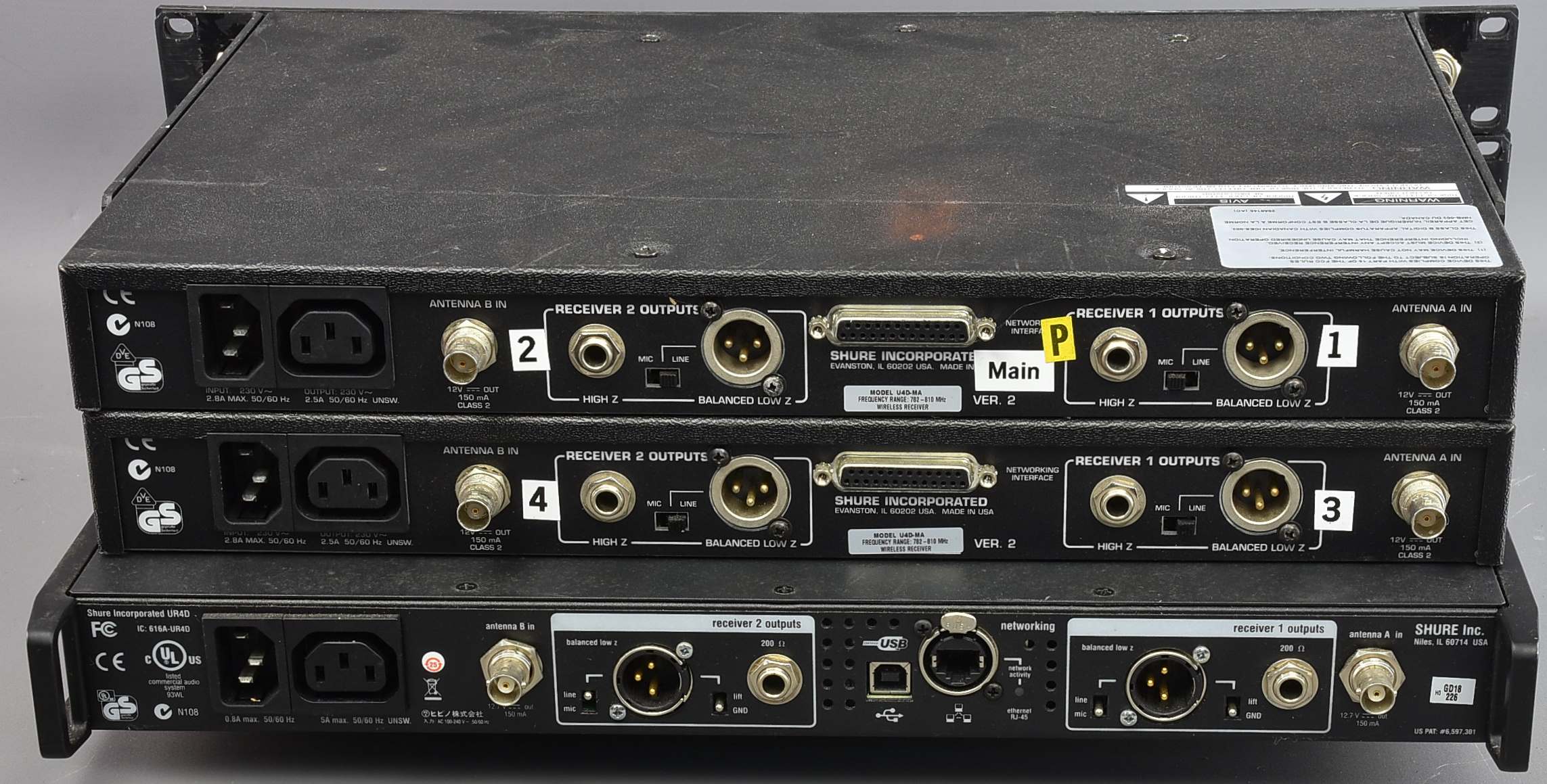 Huge lot of Shure stage wireless microphone gear from Genesis - UR4D Dual Wireless Receiver with Audio Reference Companding, two U4D-MA Wireless Receivers, and eleven UR1 belt-worn transmitters. Maybe 10,000GBP plus when new. Probably Mike & the Mechanics' rig? The rack units seem to power on well and their displays look good. The transmitters' battery compartments look clean. The outsides of many of the transmitters had a lot of gaffa tape sticky remains, and some have what looks like some aluminium corrosion. No guarantee everything is complete - e.g. the receiver aerials seem to be missing at the moment. UK voltage. Three UK or Euro IEC leads will be included. Packing 24GBP. |