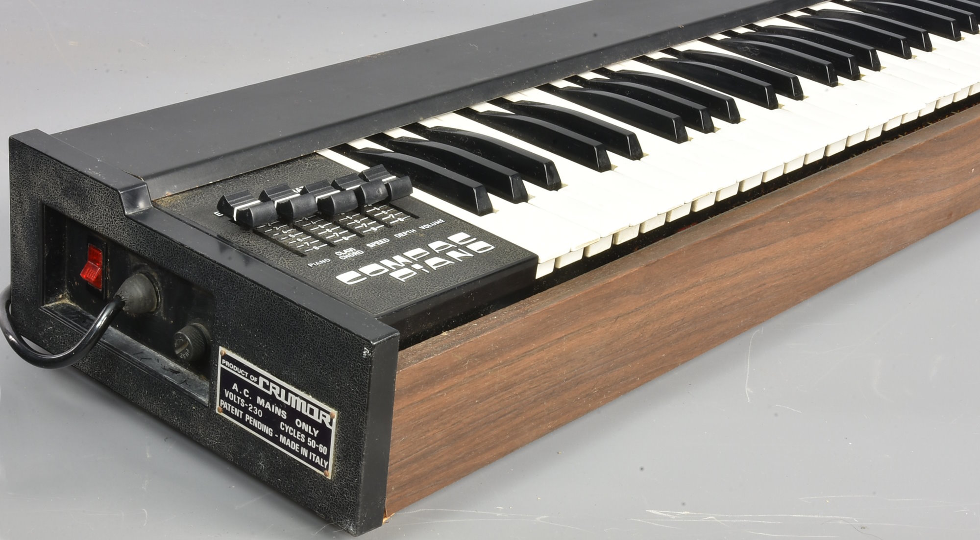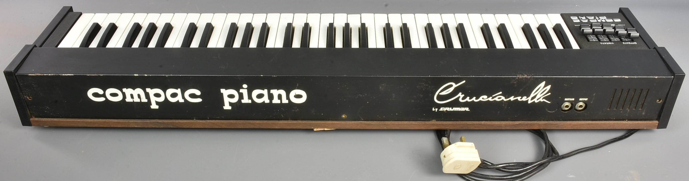 An early/mid 70s electric piano, getting on for 50 years old, and in remarkably good shape with that in mind. Not perfect working order - generally sounding good but with keys sticking (from lack of use?). Well worth a little servicing - the best of the early versions, with sliders for Piano, Clavichord, Vibrato Speed & Depth, and Volume. Slider tops have been replaced but look quite smart. With its original soft case (in 50-year-old condition) and its steel legs (in very good condition). Packing 18GBP. |