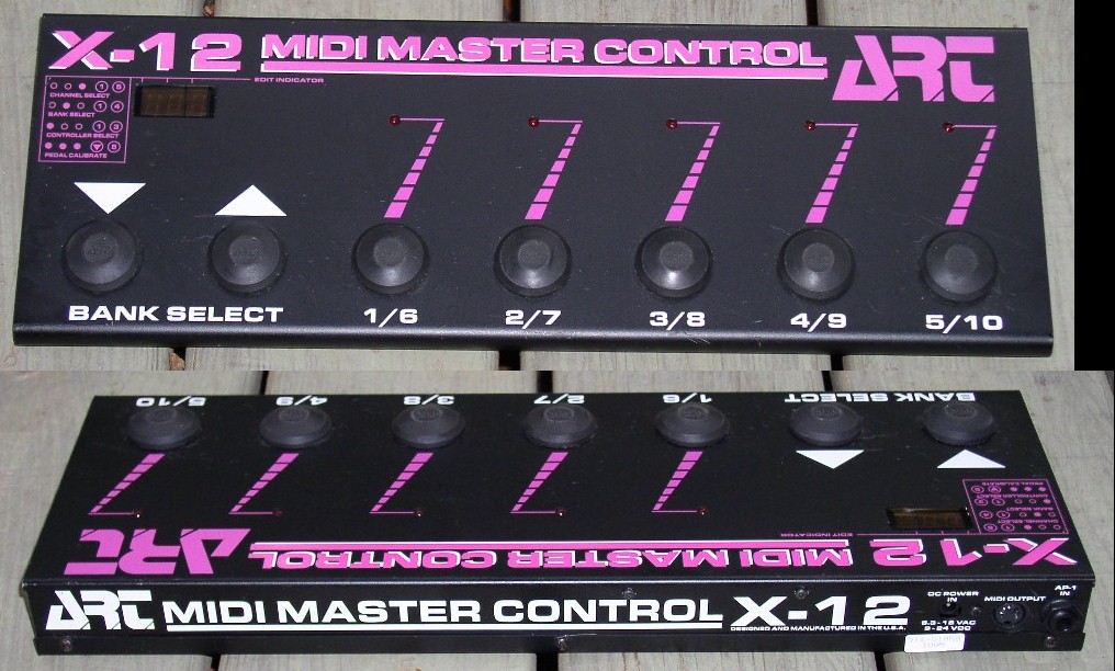 The X-12 is the controller you need if you're looking for a rugged, compact program change pedal. With its all steel construction, the X-12 provides reliable patch change messages for use with any MIDI controllable device. The X-12 utilizes the MMA's Bank Select Protocol to access up to 128, 200, or 255 preset locations. The X-12 offers a large advantage over other MIDI program change pedals in that it is expandable to grow with your processing needs. A 1/4' jack is provided for use with the A.R.T. AP-1 Power Pedal. The analog output from the AP-1 is converted to digital information, which is assignable to any of 121 MIDI Continuous Controllers for real time control of parameters. The X-12 features a large, three digit LED display and is highly visible on a dark stage.