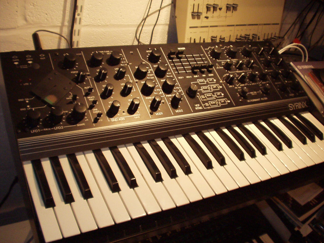 This black Syrinx was purchased second hand by me in 1985 from Chromatix of Ealing Broadway. I had it looked over at this time by Argent’s Keyboards technician. Since then it has not gigged, simply sat on a shelf with other bits and pieces, and been played for my own amusement. It has provided plenty of that. It comes with a manual and patch sheets, mains lead, CV and gate leads and a really solid Bulldog flight case. It has recently been serviced by Tony Allgood of Oakley Sound Systems and his service report and opinions about its internal history are included.* see below*. These seem to point to the fact that before my owning it, various modifications were made to the PCB. Anyway it still makes an extraordinary sound and for string/guitar sounds, the unique function–assignable pressure sensitive pad is just like the vibrato used on a fretboard.