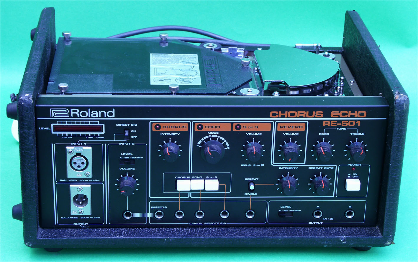 A very nice looking Roland RE-501 Chorus Echo, with balanced inputs, a great chorus, and reverb working well. It makes any synth sound funky and powerful.