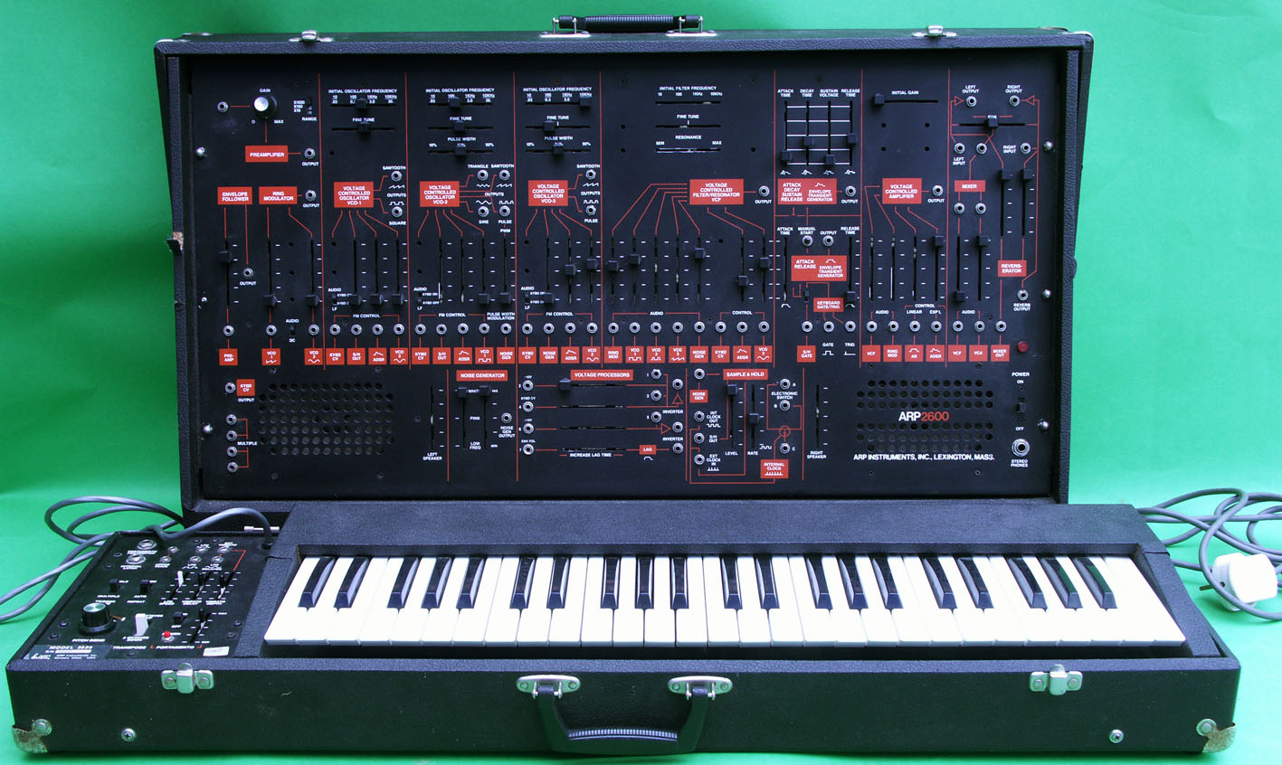 Cosmetically, apart from the broken sliders (and thus missing tops) it is pretty good. The panel is good apart from where some wear has resulted in slider slots where sharp instruments have had to be used.... There is a missing bolt; some tolex is drooping off the inside of a lid; at least one catch is broken; the keyboard has a missing little slider top.