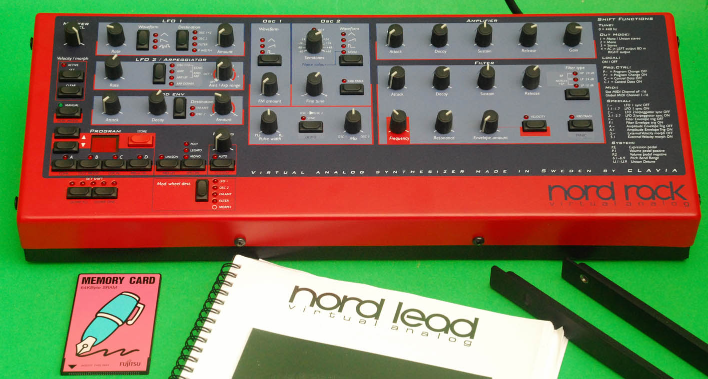 Absolutely beautiful condition, great working order, great sound, one owner from new (Ed Starink) - the extremely capable Nord Rack. With the rack ears (removed for safe transport), a 64K SRAM memory card, and a Nord Lead owner's manual. Plus the Nord Lead / Rack software v. 2.x update supplement - this Rack has been upgraded to v2, as you can tell by the extra stickers on the front panel.