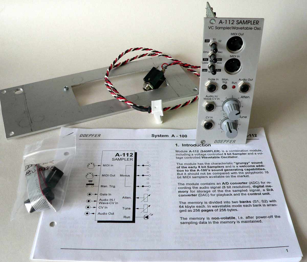 Voltaged controlled sampler with wavetable oscillator module. Includes both MIDI and voltage control. Includes original manual, Doepfer power cable and a simple MOTM mod kit comprising of a rough MOTM format panel adaptor with 1/4' output jack and power harness.