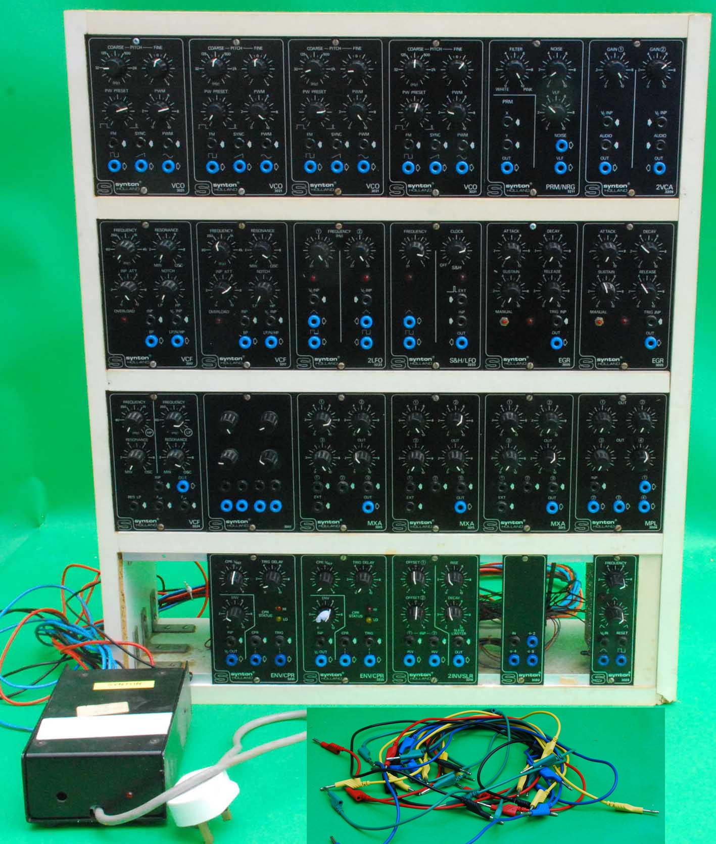 Classic Synton 3000 modules in a fairly nasty white melamine cabinet. The modules are far better cosmetic condition than the cabinet. Complete with Synton original power supply and manual, and 20 good-condition colour-coded various length patchcords. Serviced about a year ago by Bert Vermeulen of Synton, but a VCA has since stopped working.