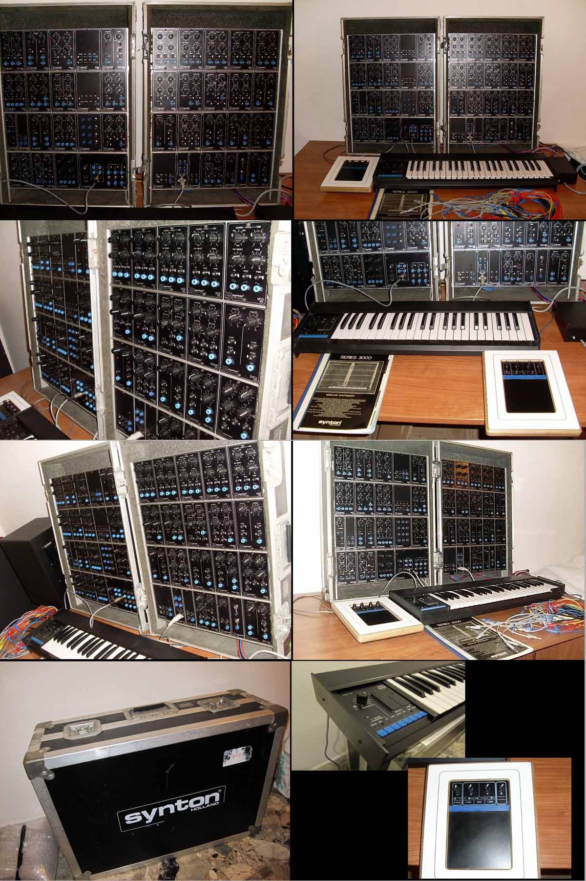Rare and large Synton 3000 series vintage modular synthesizer with special Keyboard, amazing touchpad controller and accessories set. It's an amazing modular system full of voltage controls, all in perfect condition. This modular is a special system with some rare, unique Synton modules, it was Felix Visser's personal system and expanded recently with more modules... Here is the module list: CASE A: 5x 3021 VCO's (based on CEM 3340) - 2x 3015 MXA (audio/cv mixer) - 1x 3017 VCF (notch filter) - 1x 3224 VCF double Hp + Lp filter - 2x 3010 VCEGR (voltage controlled EG) - 2x 3209 2VCA (dual vca) - 2x 3233 S&H/LFO (sample and hold + lfo) - 1x 3211 PRM/NRG (ring modulator + noise/random generator vlf) - 1x 3236 (functions reset / divider) - 1x 3003 keyboard controller I/O - 1x 3046 inp/inh/out - 1x 3235 ENV/CPR (envelope follower, comparator, trigger delay) - 1x 3016 gain out amplifier - 1x 3001 custom banana to jack multiples. CASE B: 3x 3218 2INV/SLR (dual inverter and slew limiter) - 2x 3223 2LFO (dual vc lfo) - 2x 3015 MXA (audio/cv mixer) - 1x 3242 MMX (dual clock controlled I/O) - 1x 3233 SH&LFO (sample and hold + lfo) - 2x 3004 4ATT (quad attenuator) - 2x 3006 MPL (multiple, 1 input and 4 buffered outputs) - 1x 3044 DMX (4 steps clock controlled switches) - 1x 3025 external input - 1x 3022 binary divider - 1x 3001 custom banana to jack multiples - 1x 3235 ENV/CPR (envelope follower, comparator, trigger delay) 1x 3001 custom quad attenuators - 3008 PSU unit + multiples and keyboard controller. ACCESSORIES: Synton KBM35 keyboard, very nice and unique Touchpad controller, original Series 3000 manual, a lot of coloured banana connectors. One PSU is external (Case A) and the other one integrated into the 3008 PSU module (CaseB) Working voltage: 220 or 240 volts.