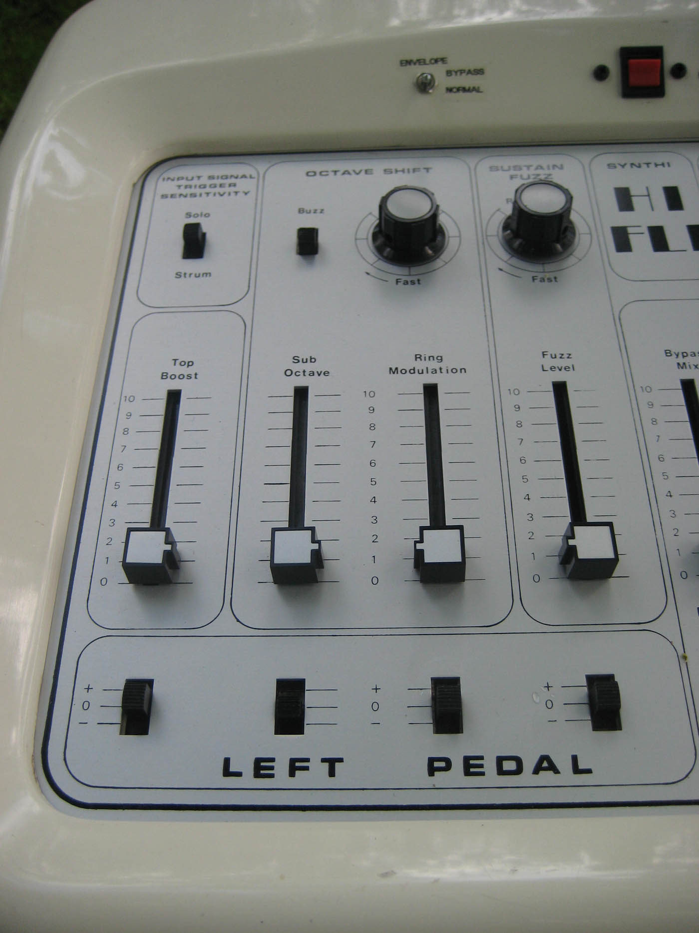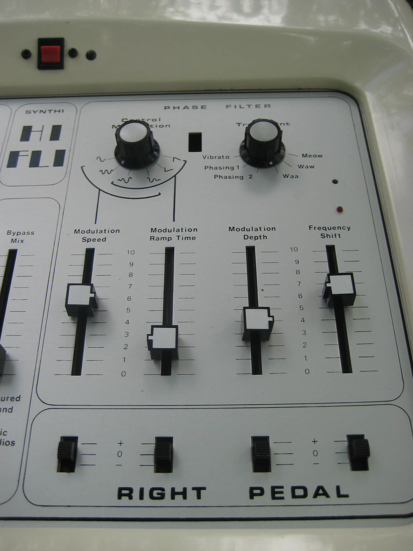 The previous owner added a useful modification switch that allows the permanent envelope system to be bypassed. David Cockerell's original design prevented the Hifli from being used with a continuous non-percussive audio signal. A mains on-off switch has also been added on the front panel.