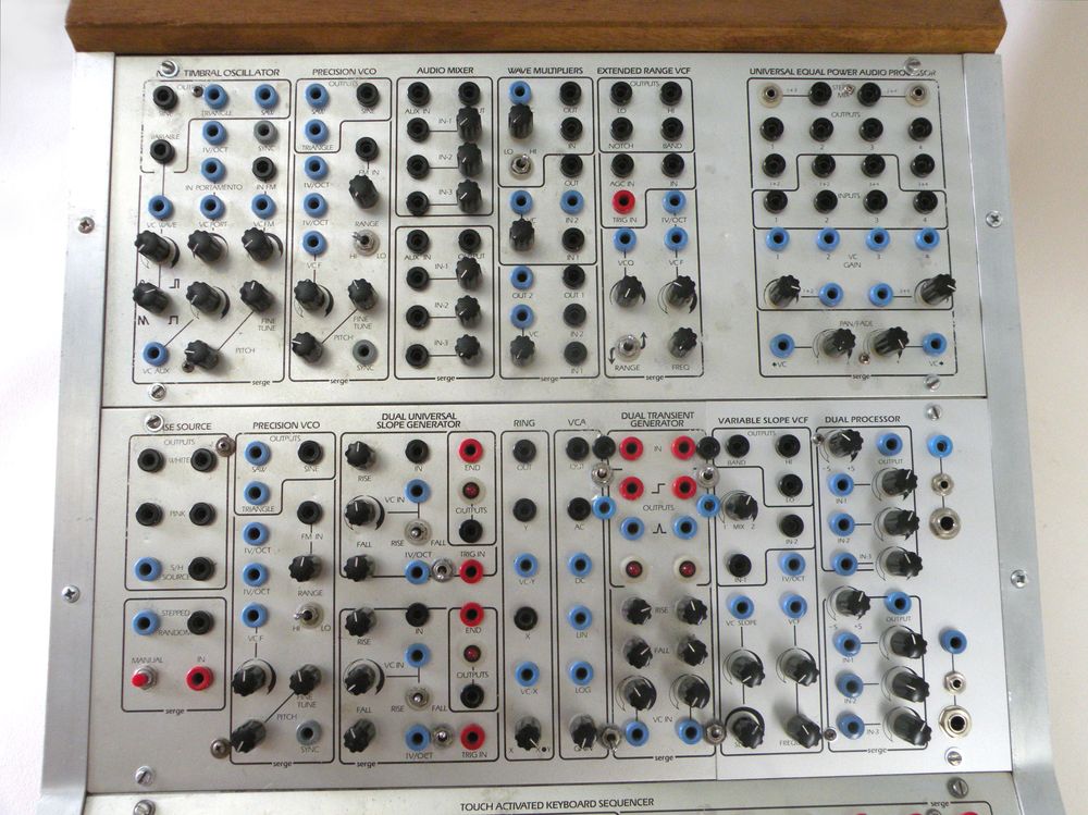 Vintage (original) Serge setup. This was just serviced and got a clean bill of health. Some older patch cables included. The middle panel got a new panel surface on the right 2 modules and multiples (banana-jack-jack). Very professionally done, no expense spared. Nice system!