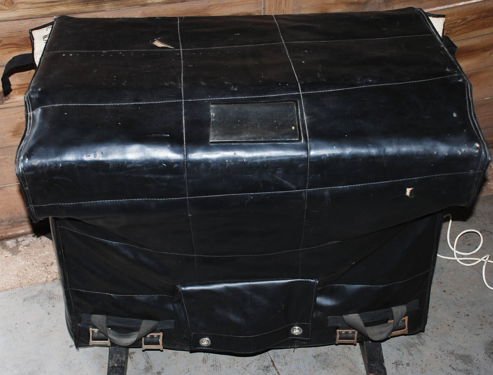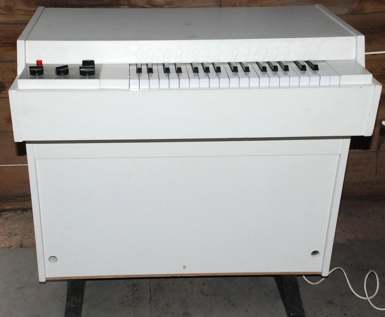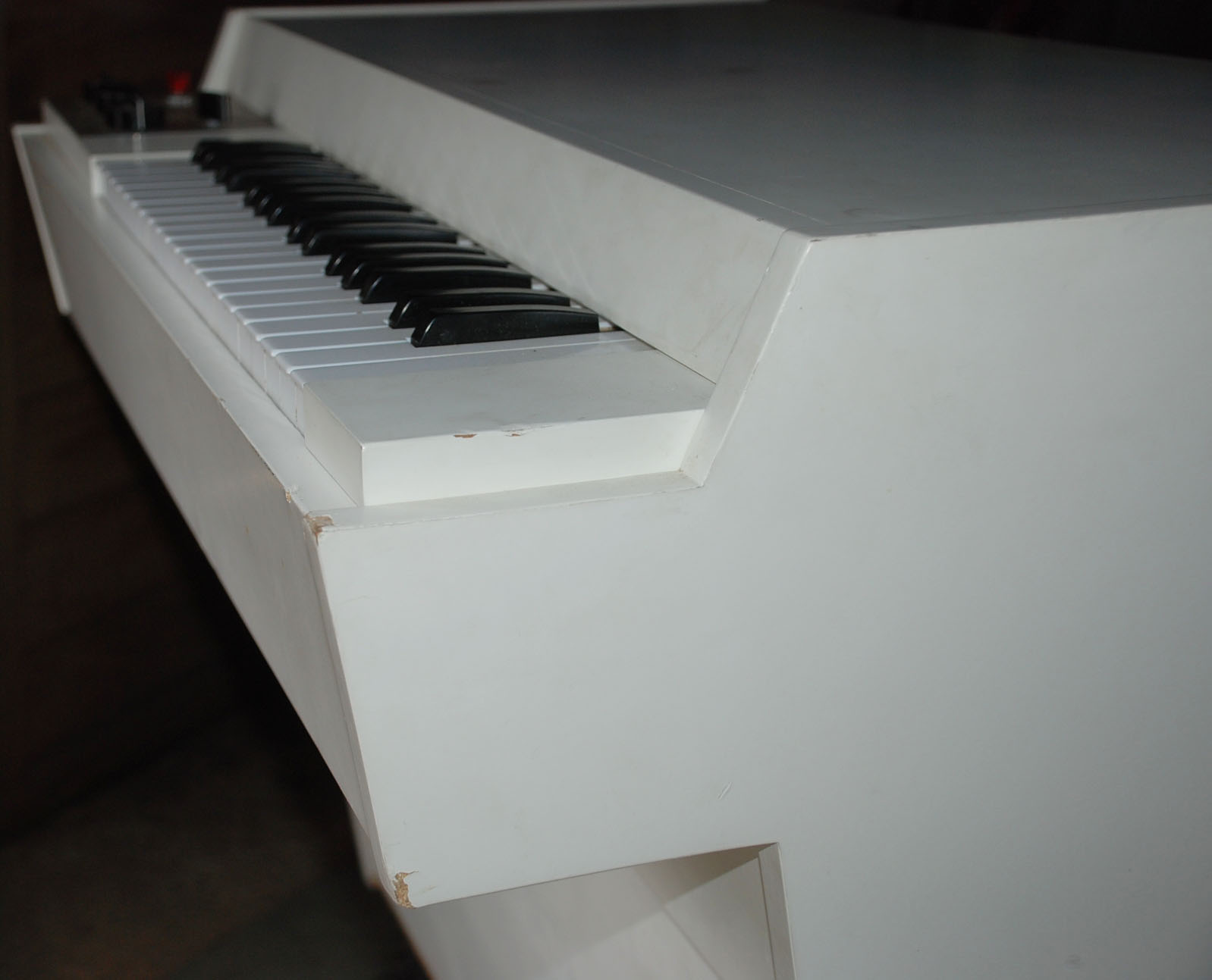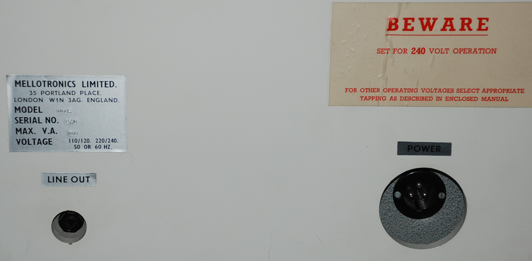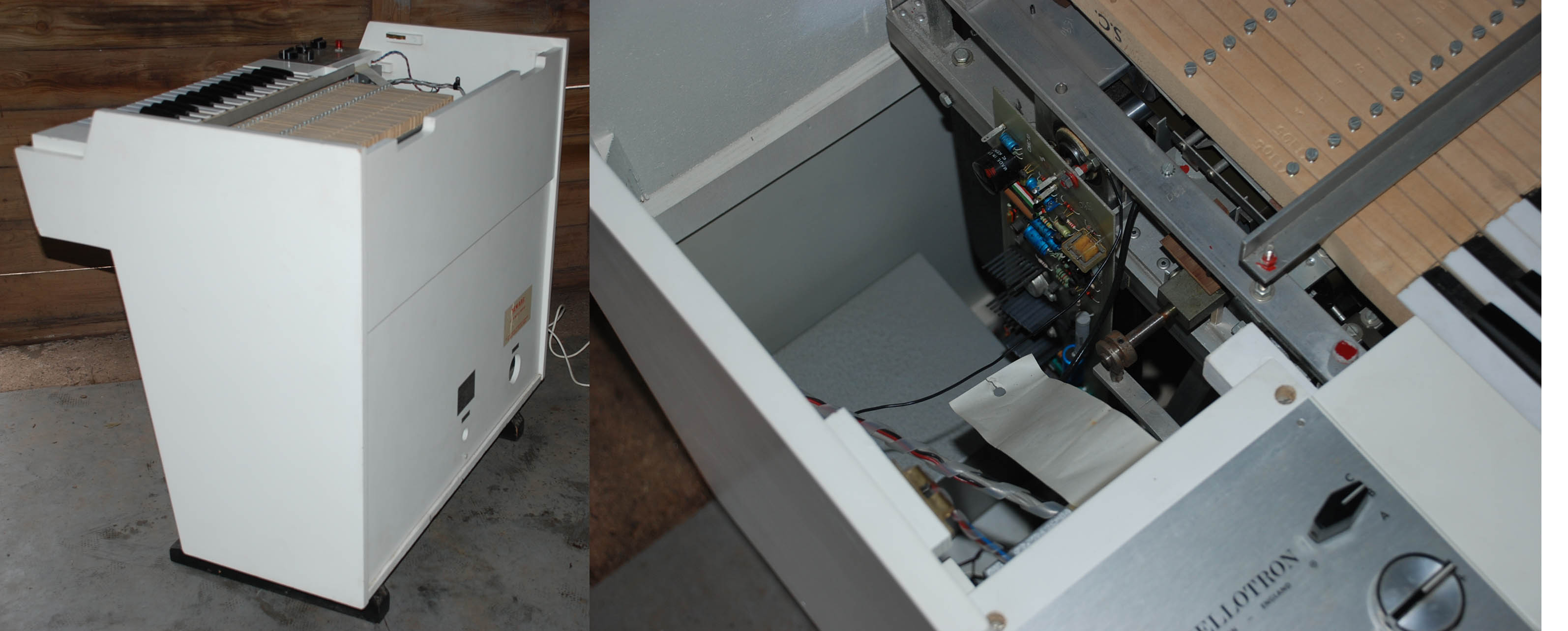 This is one of the nicest all-original Mellotrons you will ever see. nLi checked it when it arrived at VEMIA, and it honestly seemed like he was the first person who had opened it up in 30 years or more. Incredibly clean inside, and pretty excellent outside, too - having a lovely Protector Muff in good condition must have helped. There are a few marks on the top, and the right-hand edges near the keyboard have two or three small bits of damage - see photos - but otherwise the finish is still smooth and beautiful after all these years. The Muff has a tear in the top (about 10cm, two sides of a triangle), but is otherwise very good, with all straps and clasps strong and 100% functional.