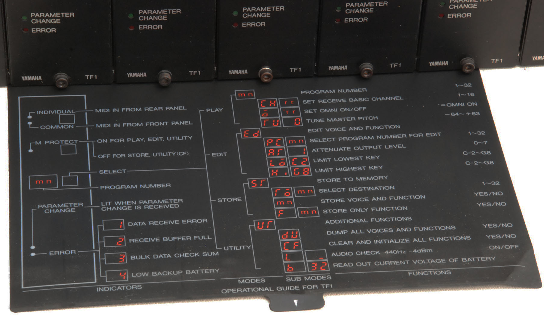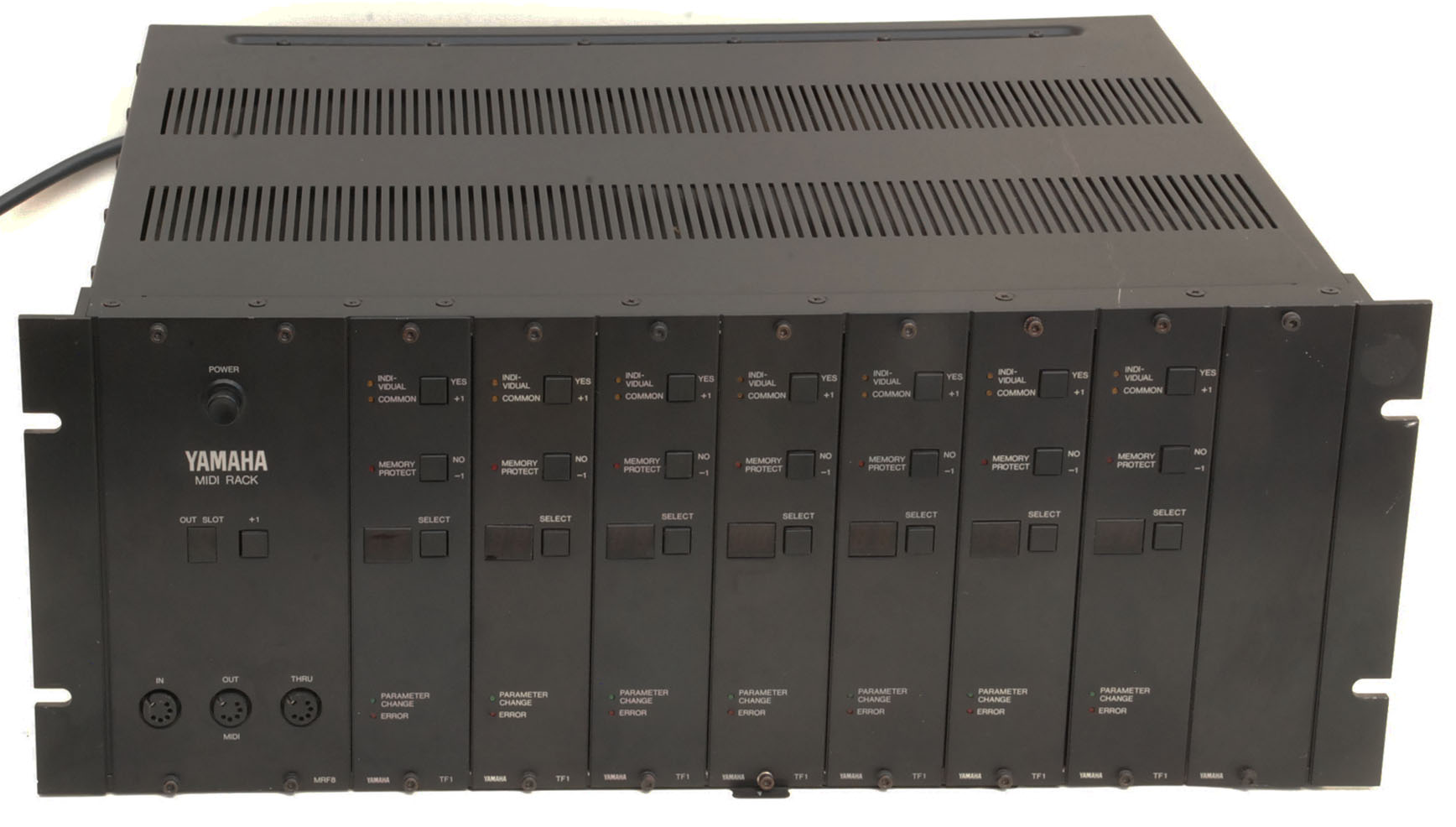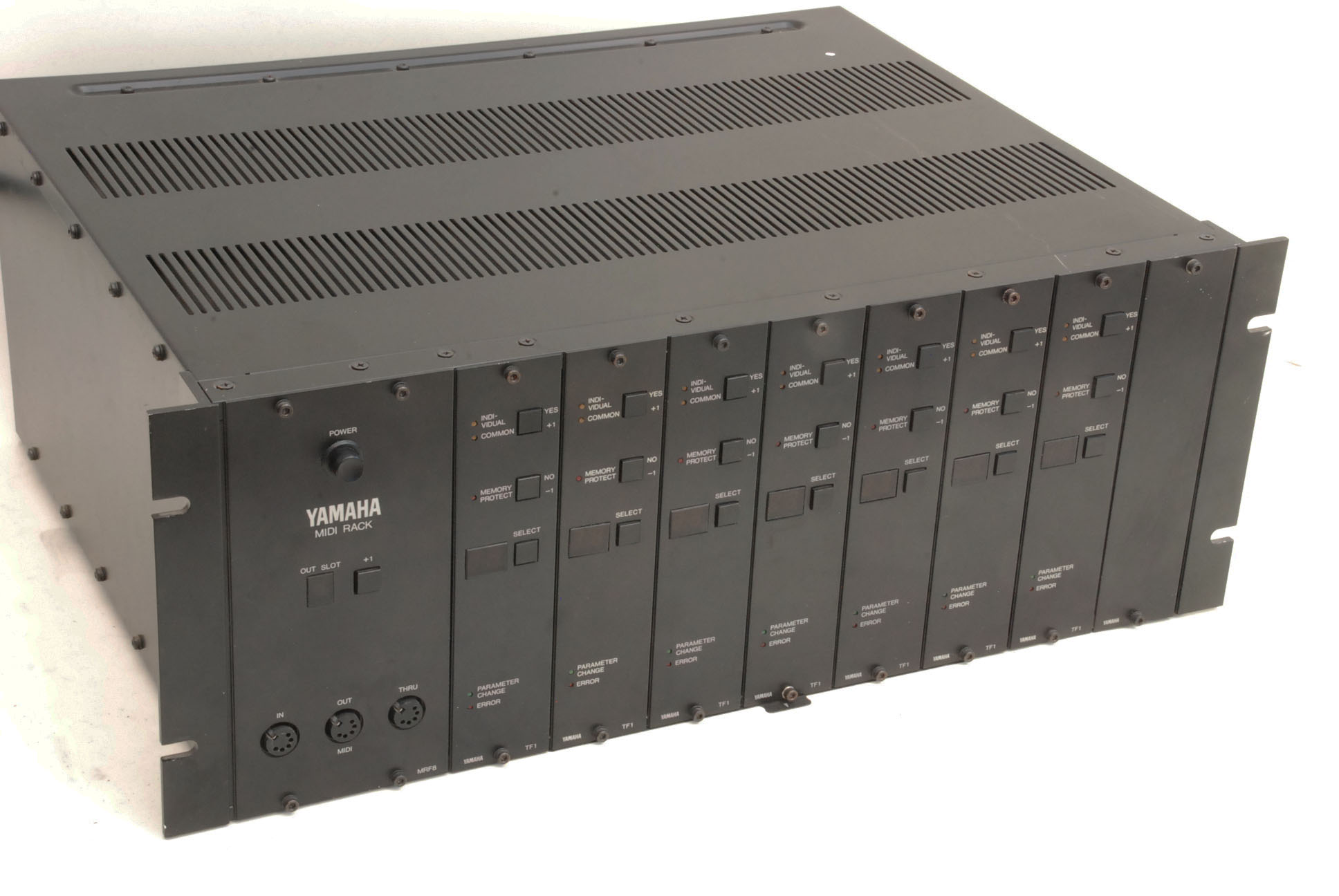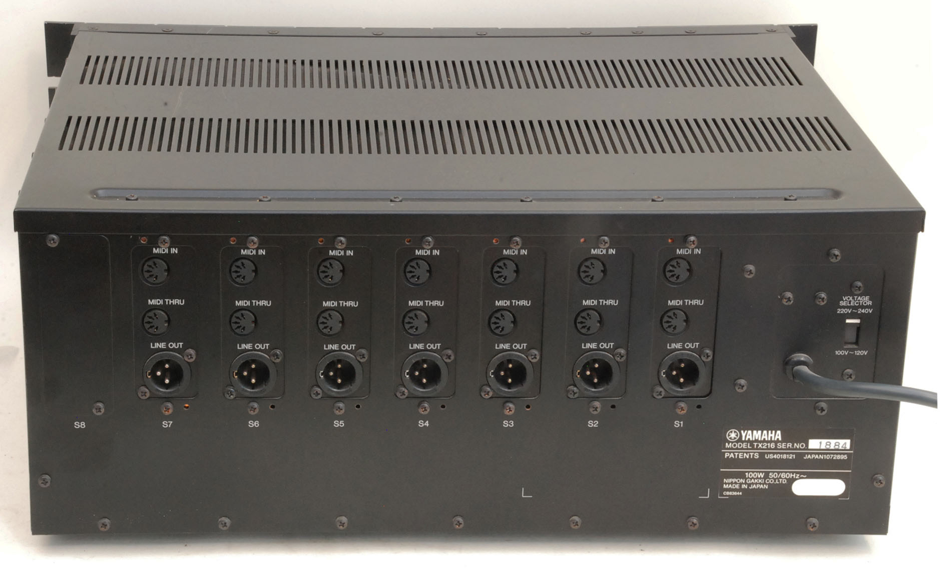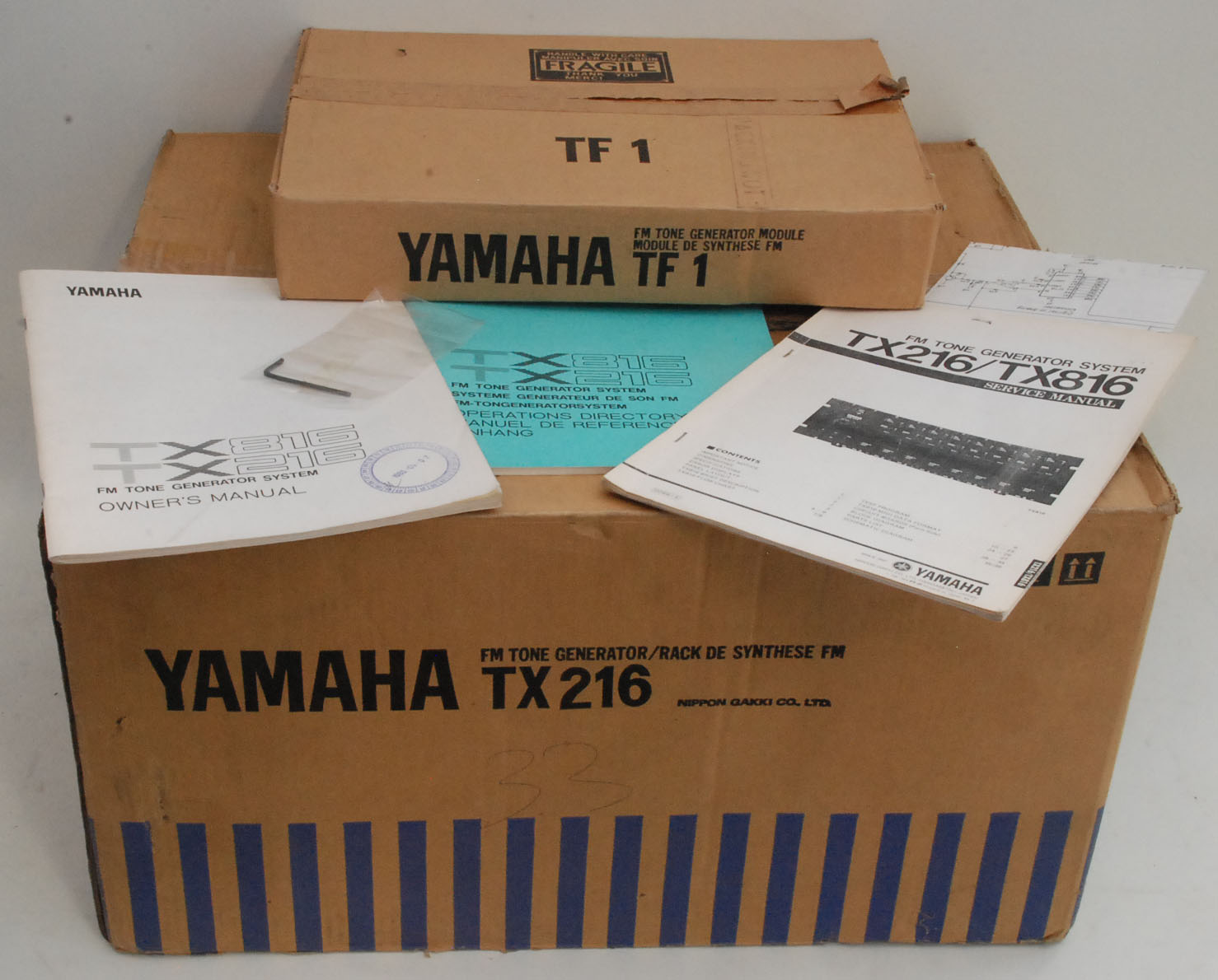 Very good condition monster professional FM machine. Originally a TX216, and then expanded by the owner into a seven-voice machine. With the original English Owner's Manual and service manual, and original English / French / German TX Operations Directory, the Allen key for modules, and its original box (missing the top polystyrene, but still very useful). There is actually a TF1 box as well.