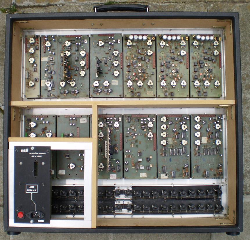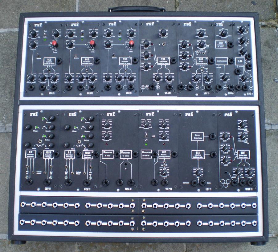 Very rare RSF Modular 11. Built from 1976 to 1978 by Ruben and Serge Fernandez in Toulouse, France. They are mostly known for the Kobol Expanders,and the uber rare Polykobol synthesizer. RSF Modular 11 modules are very hard to find, as aprox. 300 modules maximum have been built from 1976 to 1978. Olivier Grall from France is a big fan of the RSF instruments and also owns Modular 11. This system is in very good cosmetic condition. Contains: 3 VCO's, 1 VCA, 1 Filter, 1 Noise/S&H, 1 Lag Processor, 2 Envelopes, 1 RingMod, 1 Phaser, 1 Envelope Follower/Interface, 1 Mixer, 1 Power module (integrated in the back panel).