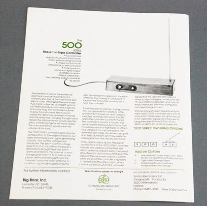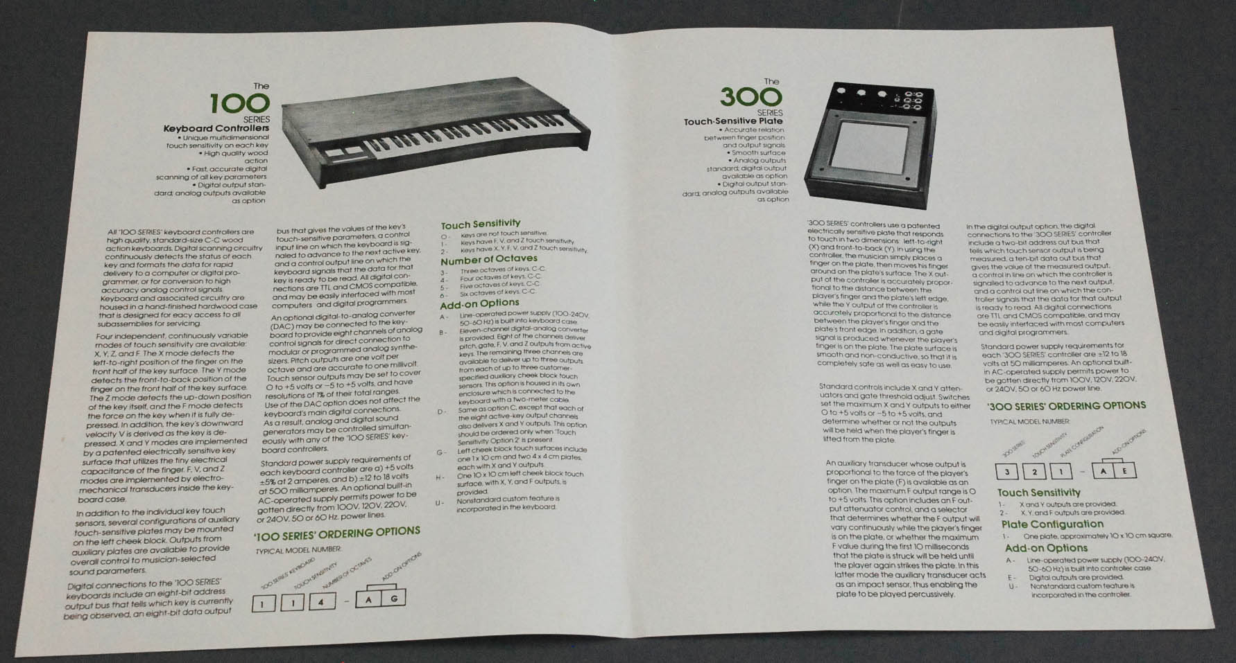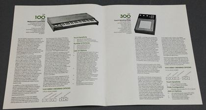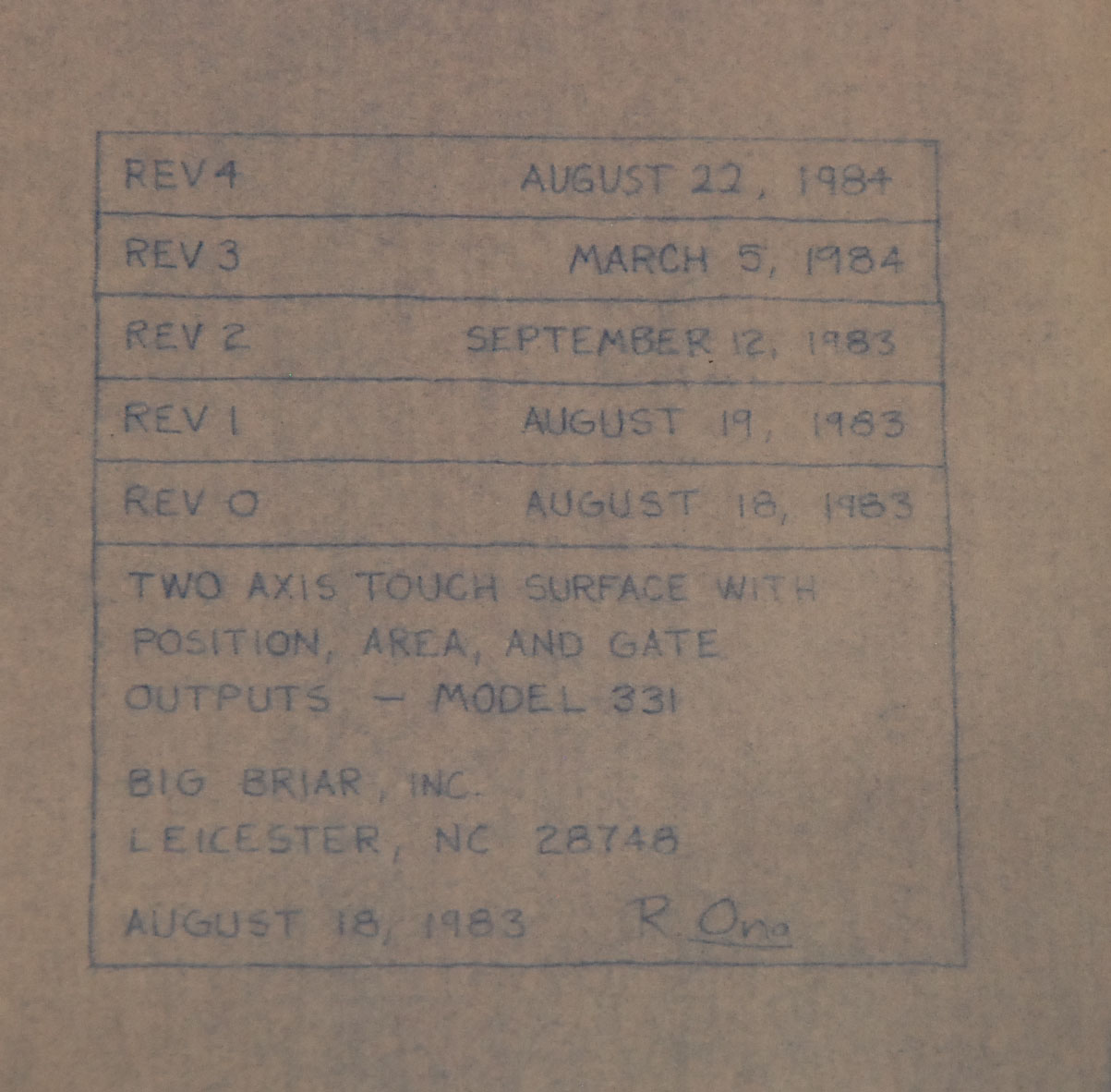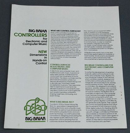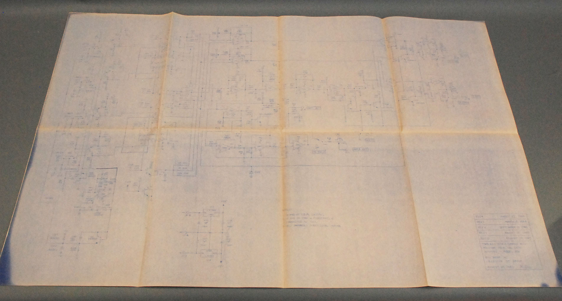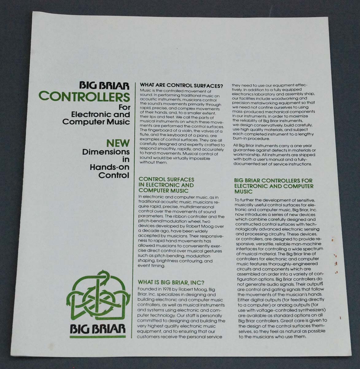 Rare publicity material for Bob Moog's Big Briar company, advertising his 100 Keyboard Controller (with multidimensional touch sensitivity), 300 Touch Sensitive Plate, and 500 Theremin-type controller. Plus the even rarer 'blueprint' original schematics for the 331Touch Plate, with revisions 0-4. Faded like all these blueprints, but still entirely legible and looking unused. |