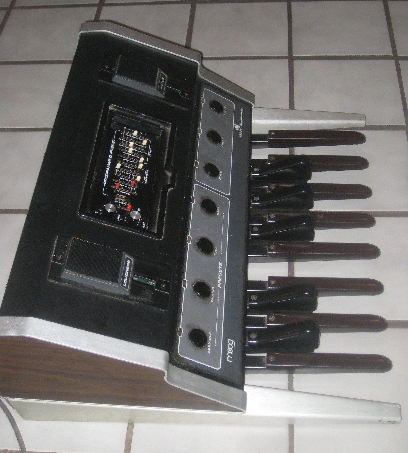 The Moog Taurus I is housed in a rugged aluminum and wood casing and, although known primarily for its bass timbres, has a five-octave overall range. It is a monophonic analog synthesizer with an overall range of 5 octaves triggered by a 13 note set of pedals (1 octave C to C configuration). Three stock preset sounds are available along with one user-programmable Variable sound - the parameters of which are adjustable within a top, centrally located compartment. The three non-variable Presets are named Tuba (single oscillator), Bass, and the famous Taurus. The following parameters are foot switchable: Glide (on/off), Octave (+ 1 octave or Normal), Release (long release on/off), and the three stock Presets and one Variable Preset. Top mounted foot controlled sliders affecting volume (Loudness) and filter cutoff (Filter) are also provided. A unique feature of the Octave function allows the player to change this footswitch setting while an unpressed note was sounding, with actual transposition only taking place immediately upon the next note press, allowing for smooth, predictable changes during performance and recording. The Taurus I's FET-based integrator oscillator and classic Moog 24dB/Oct Low Pass Filter produce a unique, edgy, penetrating timbre which is not exactly duplicated by any other instrument and is widely regarded for its extremely rich, 'fat' sound, which is oftentimes more felt than heard when greatly amplified.