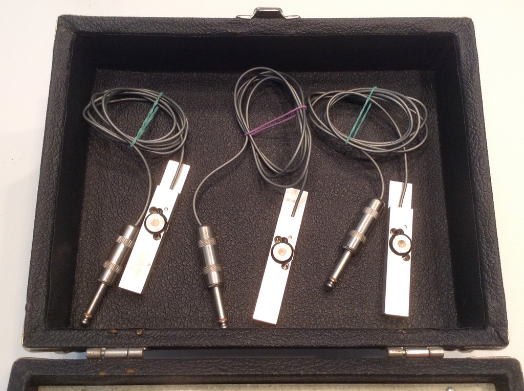 Made in USA in the early 1970s, This suitcase is basically DOOM IN A BOX. When you open the lid, you are faced with THREE of the most brutal monstrous fearsome vintage fuzz boxes ever made : 3x Foxx Tone Machines Fuzz Boxes !!! The craziest part is this was intended originally for electric guitar AND steel guitars, so on top of plugging in your guitar through one of the panel's three 1/4 INPUT JACK, it also came with 3 acoustic pickups to be placed under the strings that could each be plugged simultaneously into each one of the 3 Tone Machines for total chaos and annihilation of sound bytes :-D By now you realize this is THE MOST INSANE VINTAGE FUZZ BOX EVER MADE ! It is also amongst the rarest, and even more so with the 3 original acoustic pickups still present and included. A true Holy Grail of vintage fuzz box collecting. must have. |