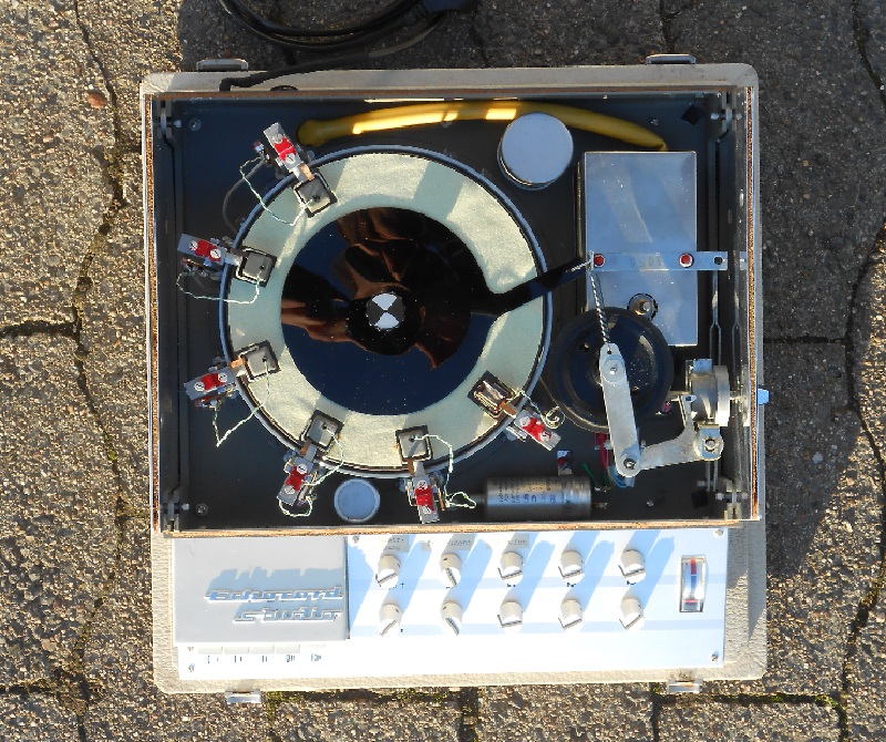 Electronically, it works, at least to some extent – the echo playback is continuous so it seems as if the erase head does no longer do what it is supposed to do. All the playback and recording heads work and can be switched on and off, using the selector buttons. Also, the magnetic foil shows some wear and tear and should be replaced by something that does the job equally well (e. g. the innards of an 8“ floppy disc, cut to measure). I just don't have the time and energy to have this unit overhauled completely by someone who knows what he is doing, that's why our ways are parting here.