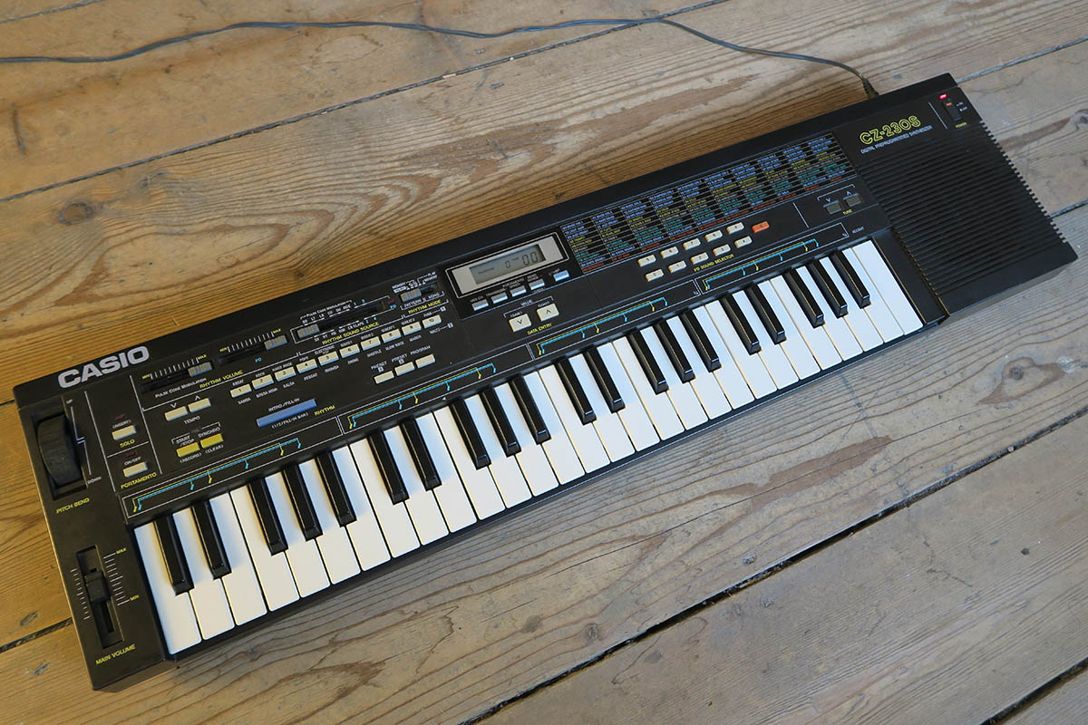 Casio CZ-230S synthesizer, essentially a preset CZ-101 (some of the presets can be swapped via Sys-Ex/MIDI) with a programmable drum machine (based on the RZ-1). 49 mini-keys and built-in speaker, this keyboard is in very good condition with just light cosmetic wear.