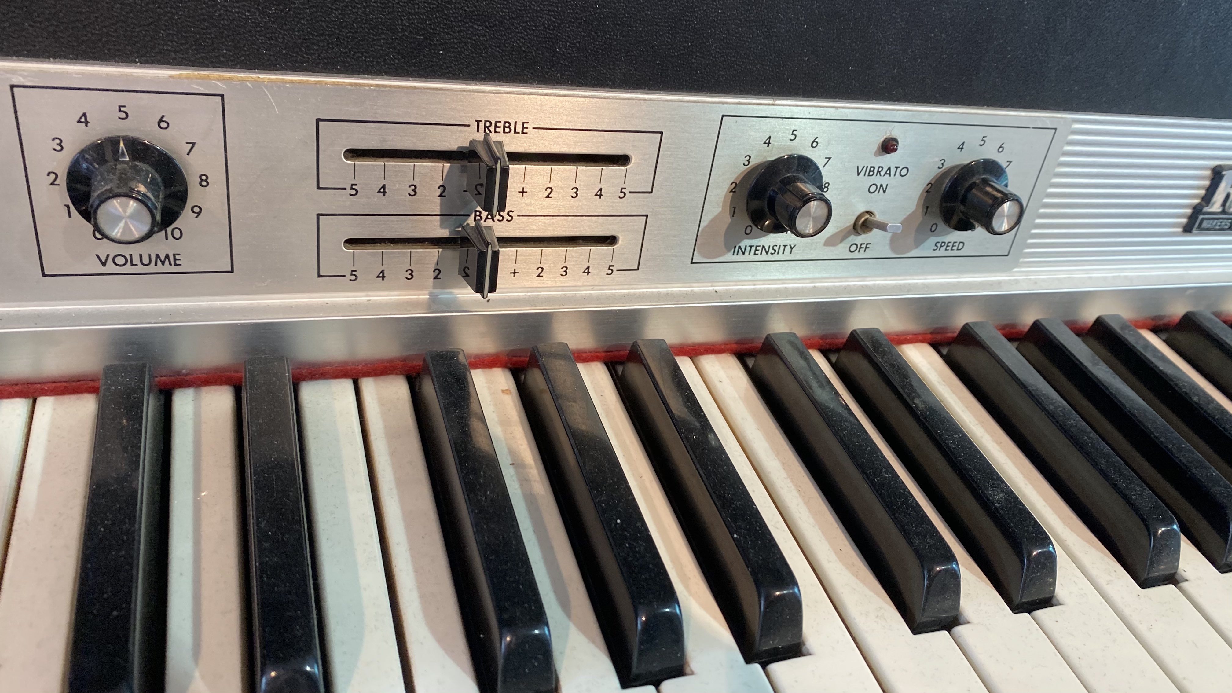 Very nice suitcase rhodes with two rare speakers on wheels. Speakers show wear, but work very fine |