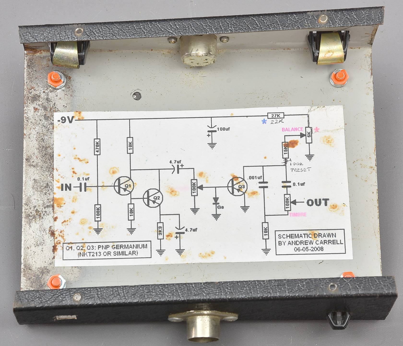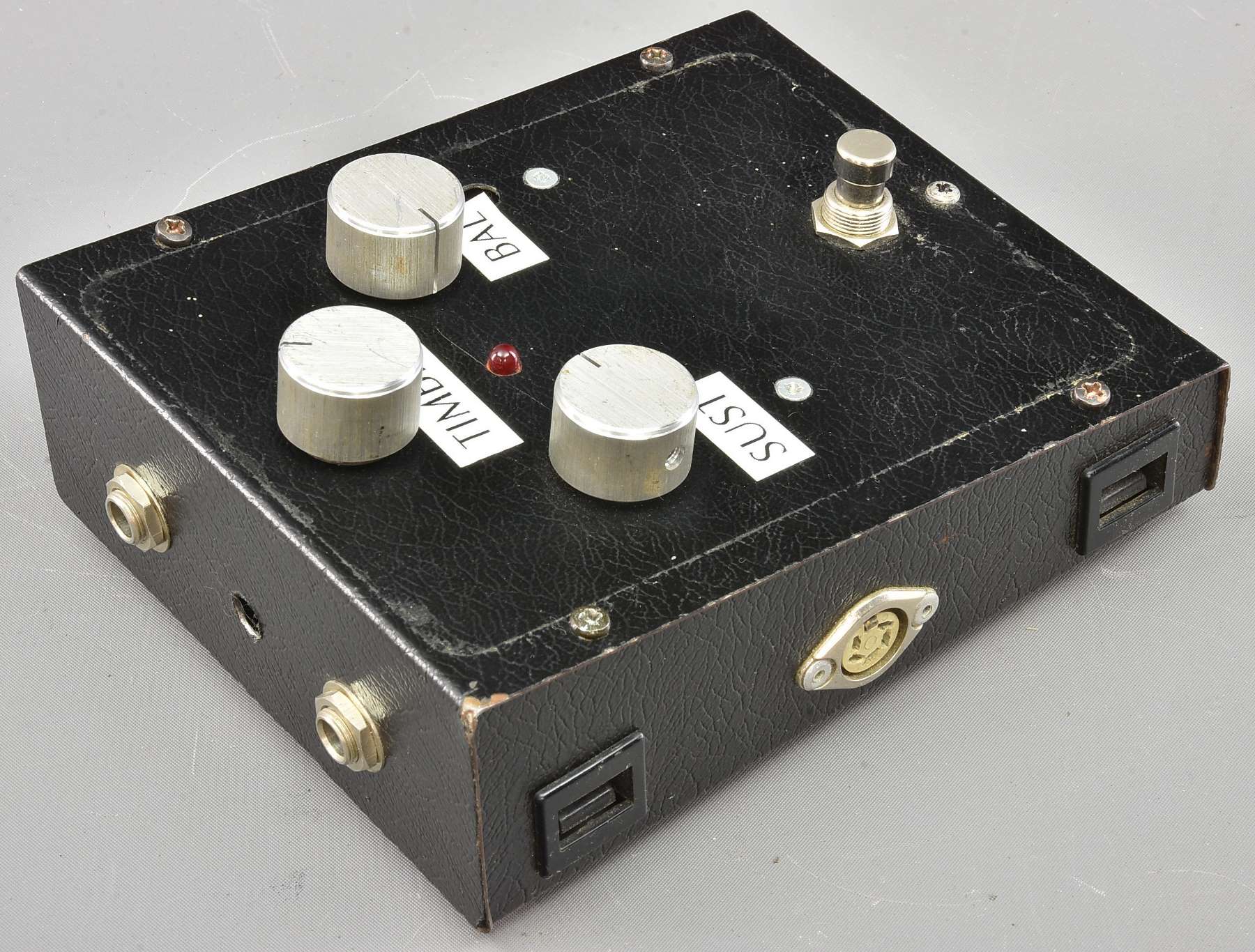Very interesting and rare Bell Electrolabs Sustain box, part of the clever interlinking system designed by a BBC engineer. Please see a past lot 24476 for the Mother unit which provides power (and also in that case a famous ADT module). The boxes link together physically and with a power link. This unit seems to have been rebuilt and doesn't seem to resemble the one other unit I've seen the innards of - but with three vintage RAY 363Y PNP germanium transistors it definitely seems to use the right stuff. This unit has had its graphics sticker removed and replaced with home-made labels. It is in good working order. Packing 3GBP. |