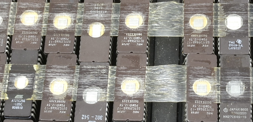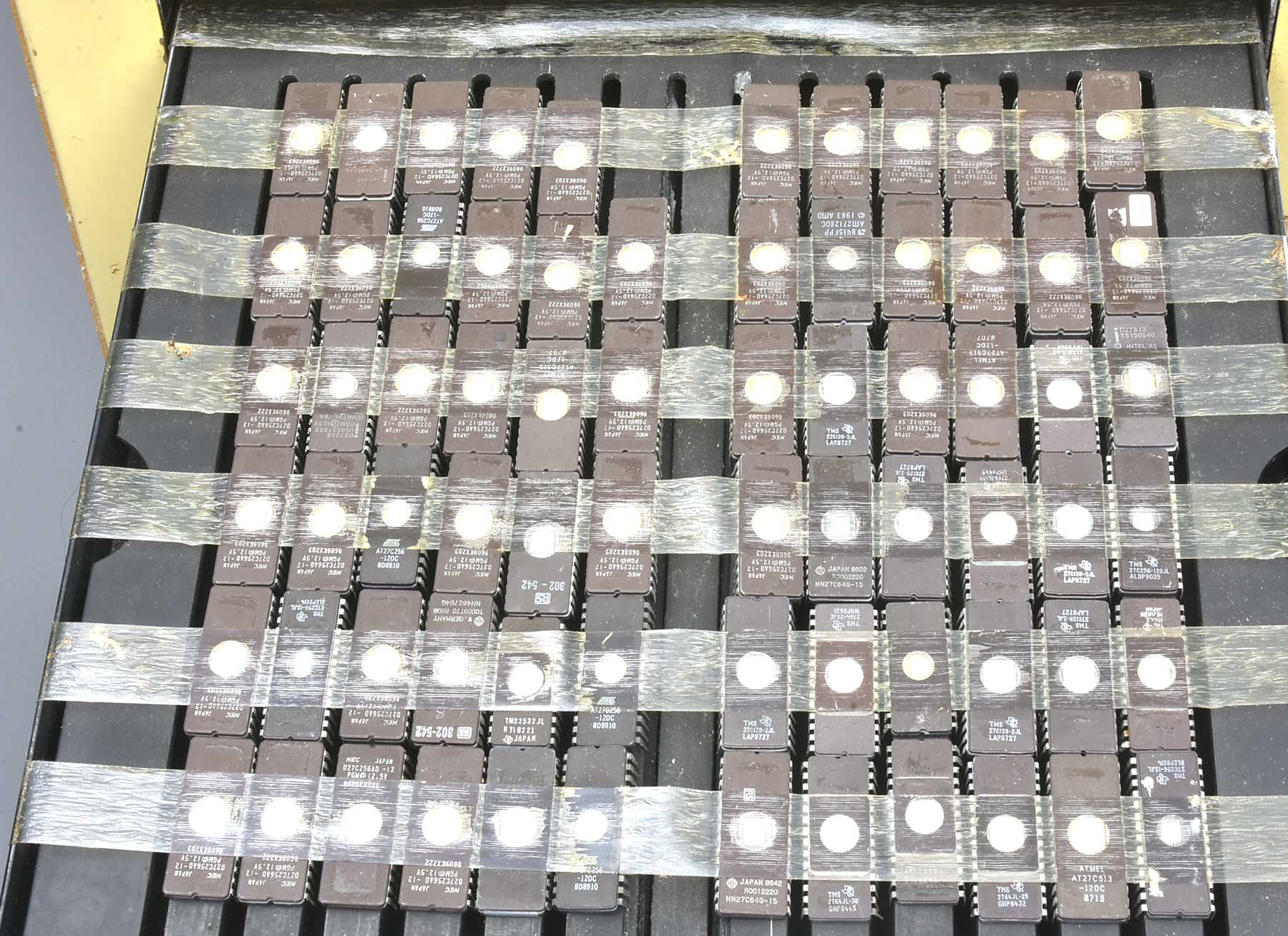 A large vintage EPROM eraser, UK voltage, with a large quantity of EPROMs inside - mostly Japanese NEC DZ7C256AD, but also, eg, Intel and Atmel. Serial number 10150. **Sold as seen.** Packing 12GBP. |