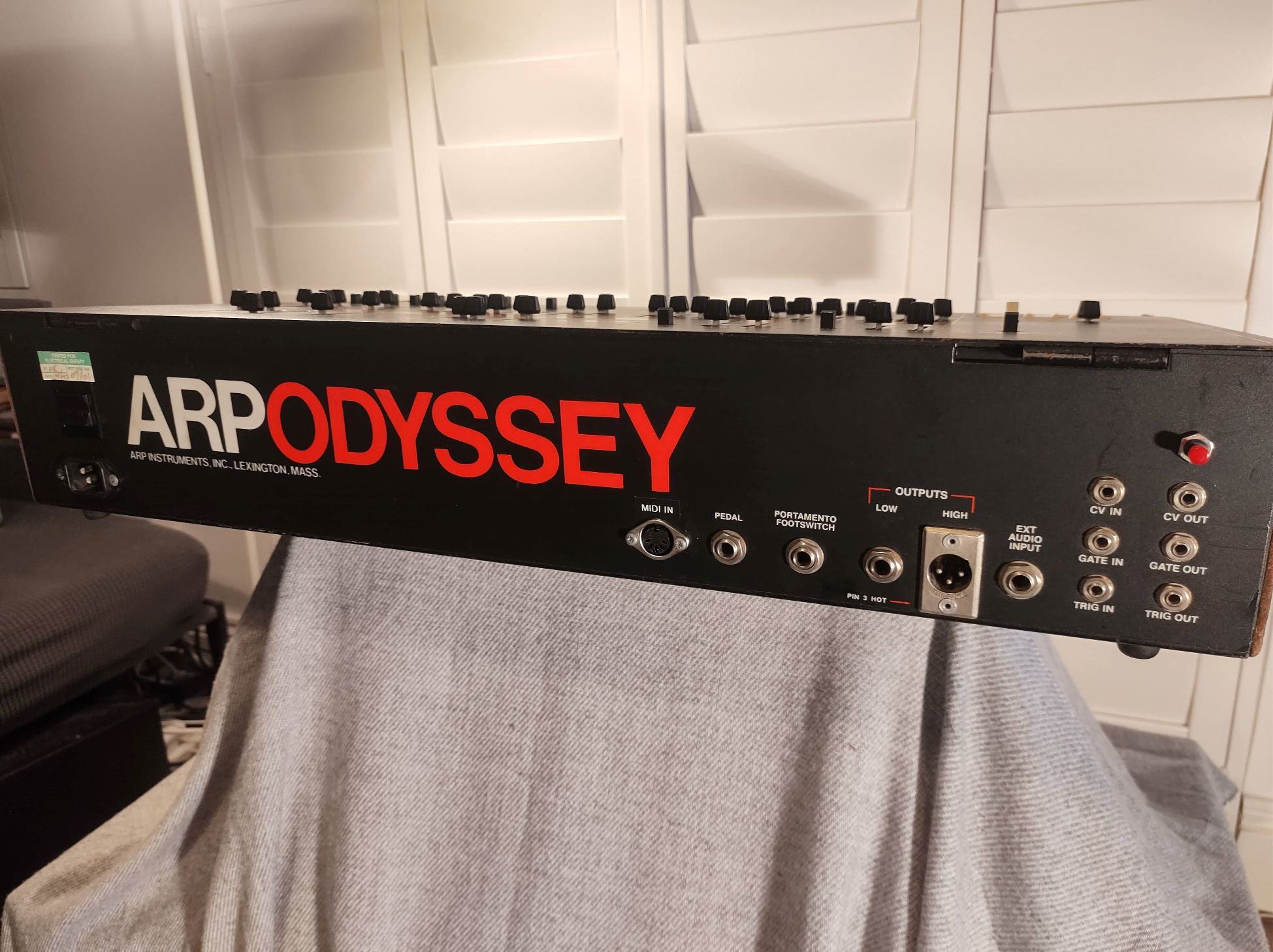 Original ARP Odyssey MKIII (2821) duophonic synthesiser, with full custom metal flight-case, and Kenton installed MIDI retrofit. Orange-on-black colour scheme. The Mk III features the four-pole '4075' filter, unbalanced XLR output, and PPC buttons. Some of the sliders are a little scratchy, but will use dry film lubricant to clean those up. Amazing cosmetic condition for age - faceplate easily a 9/10, no serious no dinks or chipped keys. That said, the leather sides are scratched in places, as you might expect for her age, but look more prevalent in the pics than with own eyes. Requires C13 female power plug. Collection from NW London near bottom of M1. Free delivery by car within M25. Delivery further afield might be possible by arrangement inc. fuel cost. I will be away until April 20th but everything will be ready to despatch on my return. |