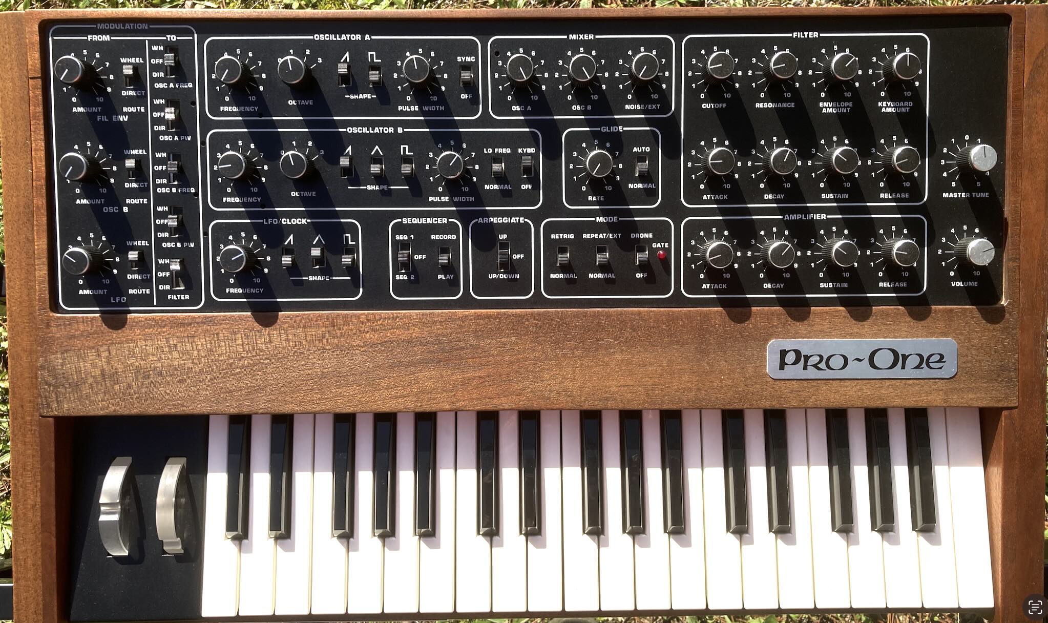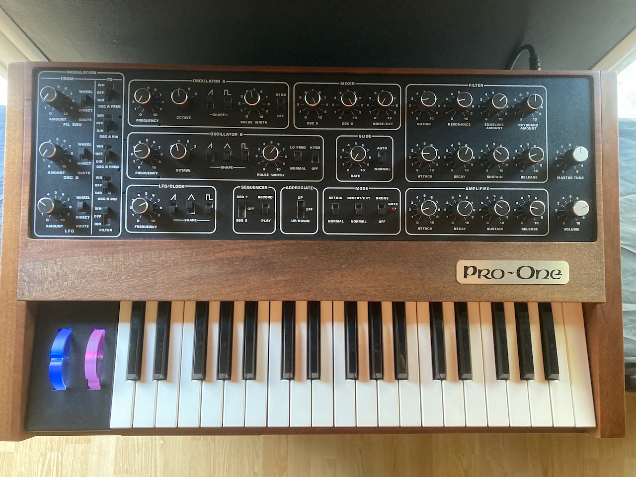 Sequential Pro One with beautiful custom Prophet style wood case and P5 knobs. |