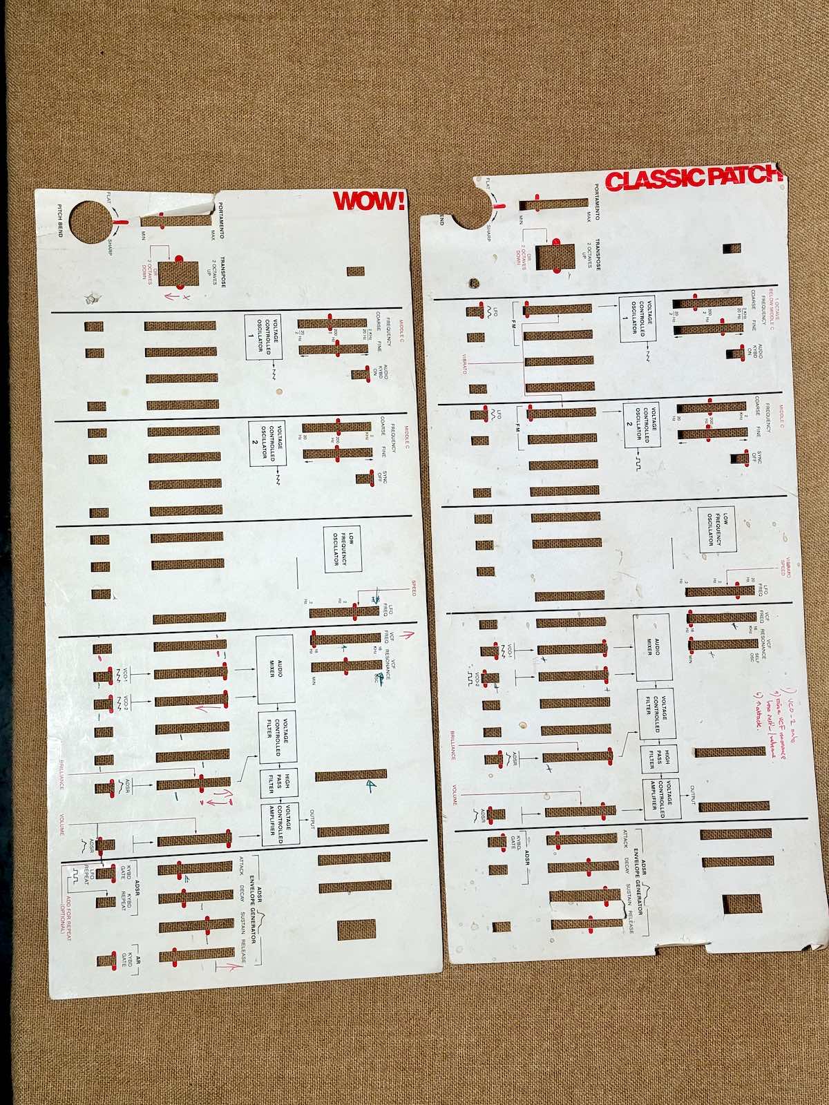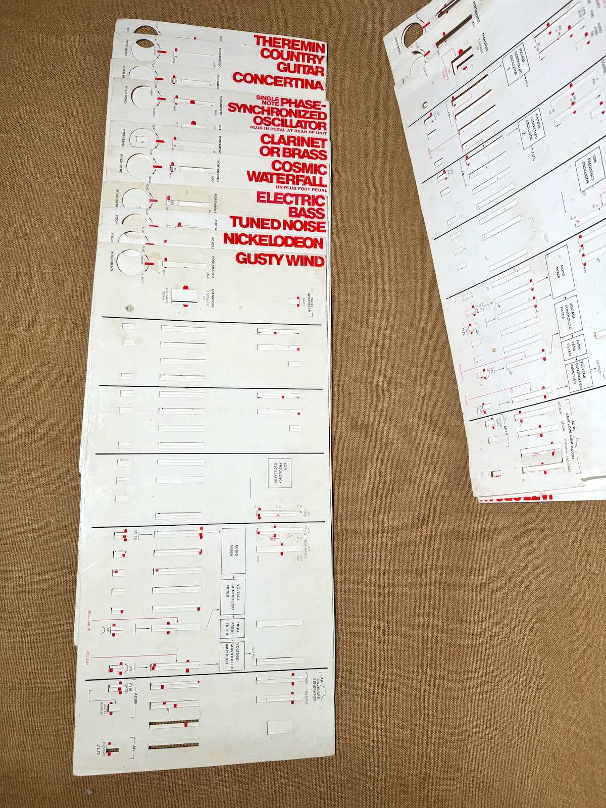 ARP Odyssey templates dating from the white face generation. Unusual items which could be of interest to ARP collectors. Good cosmetic condition overall but I have highlighted in photos the templates that have significant wear and tear. Last photo is for demonstration purposes. |