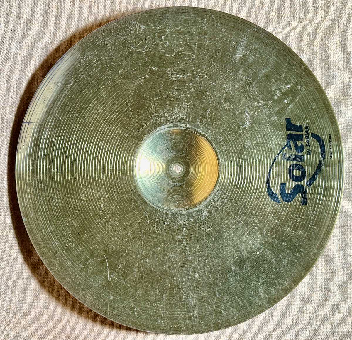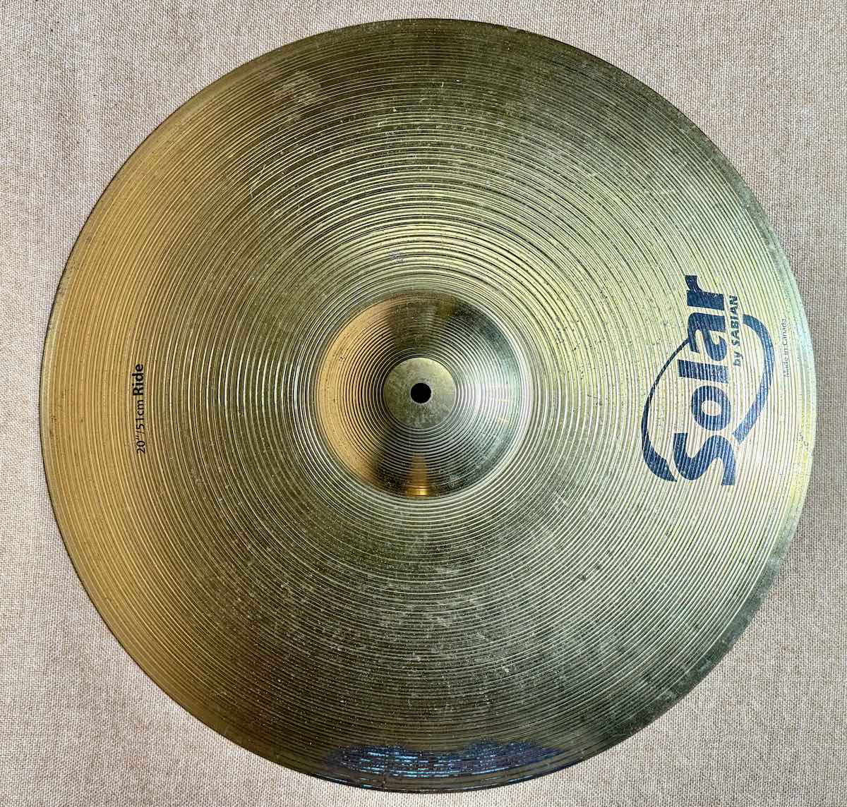 Sabian 20in ride. Made in Canada. No cracks or keyhole-ing. Bit shabby, particularly on underside. |