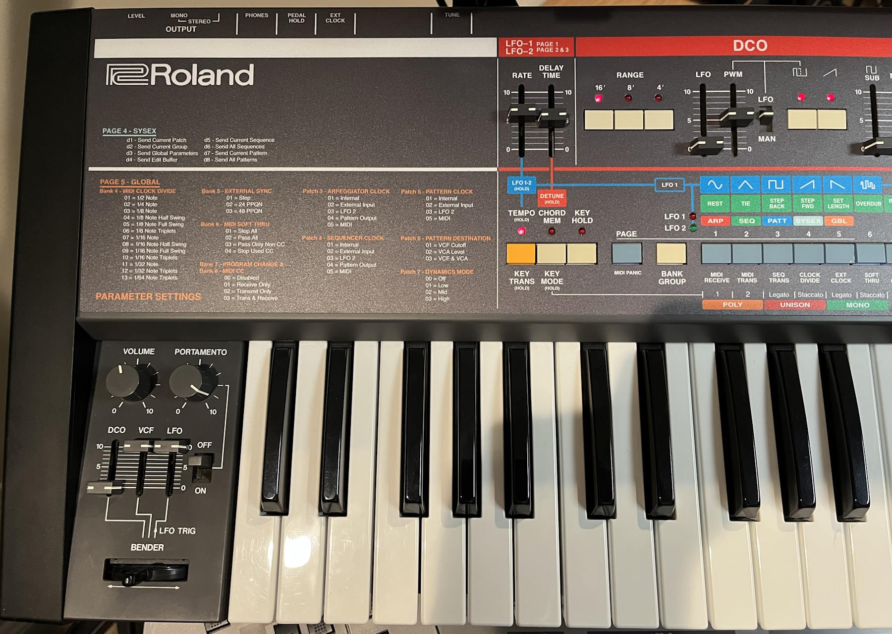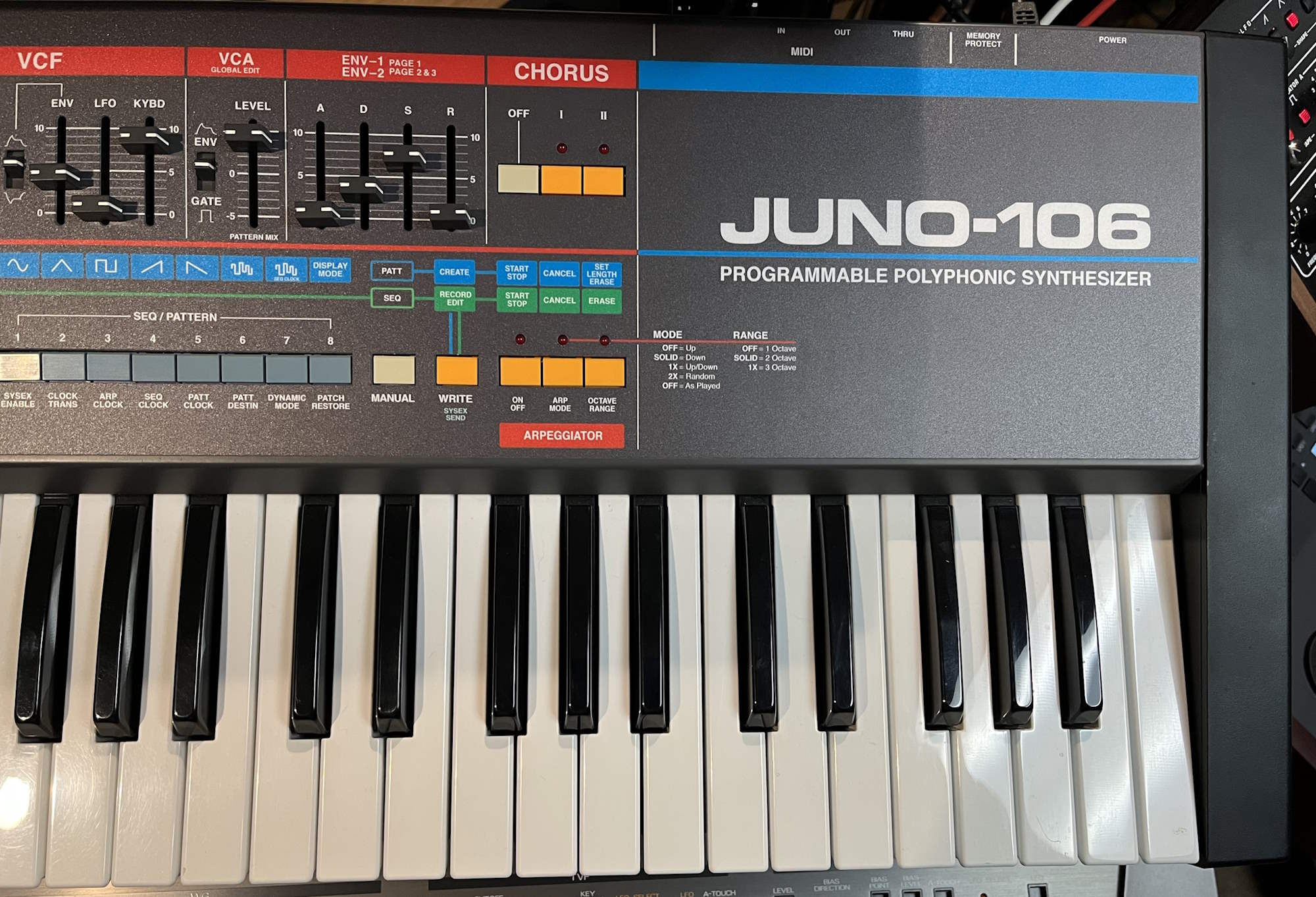 Roland Juno-106 with Kiwi upgrade. I have owned this synth since 1988 and the upgrade was installed professionally in 2014. I installed an overlay to help with the button reassignments from the Kiwi upgrade (https://www.synthgraphics.com/kiwi-106.html). In the past few years, I replaced all of the voice chips with new ones from Double Heart Audio (https://www.doubleheartaudio.com/). Everything works great on the synth and all of the sliders increment and decrement smoothly with the Kiwi features. It comes with a light-duty flight case from Roadcases.com and the original manual and printed upgrade docs, service manual, and original parts should someone feel the need to revert the Kiwi upgrade. I don’t think you will find a cleaner Juno-106 with all of these features. |