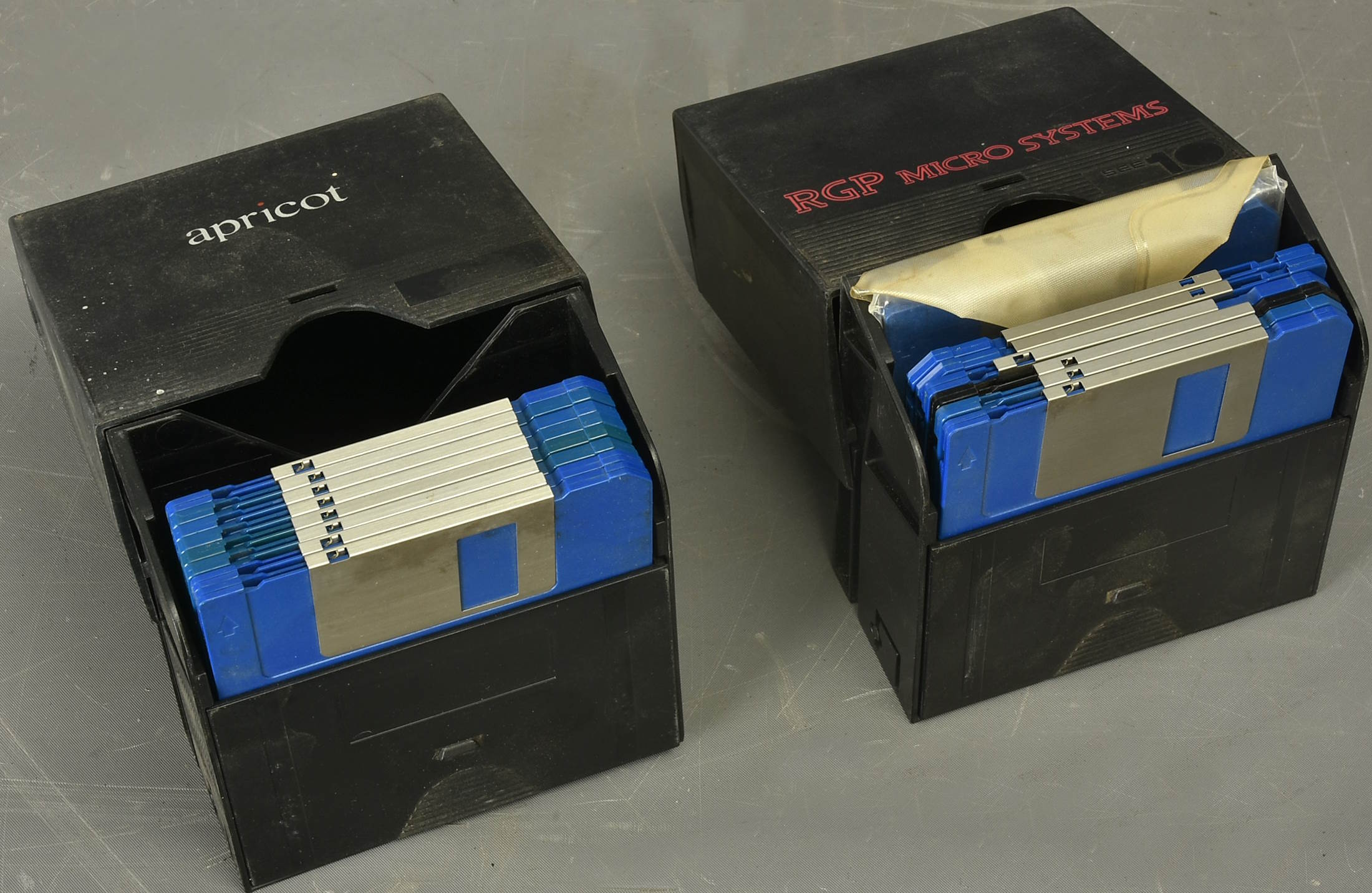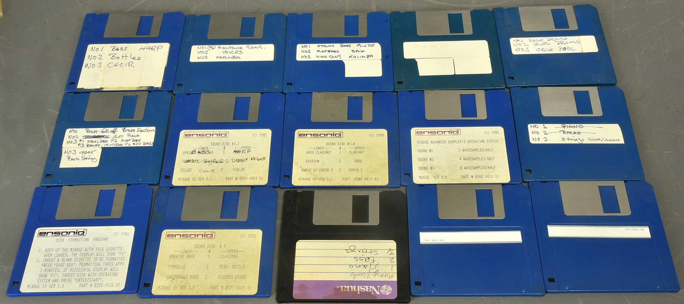 Two disk boxes containing 3.5in disks believed to be for the Ensoniq Mirage - some factory, some home-made. Fifteen, plus one which says 'no good'. All sold as seen. Packing 3GBP. |