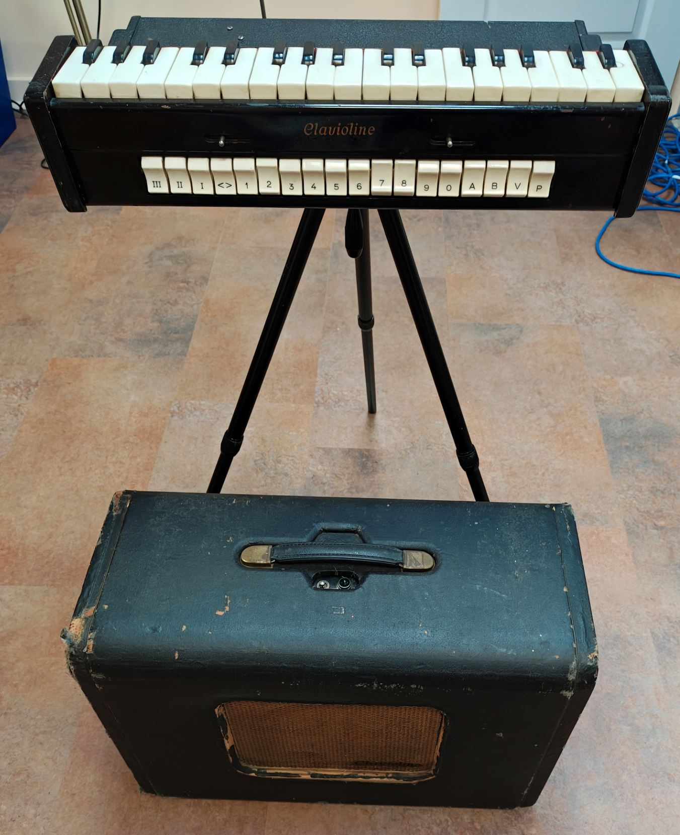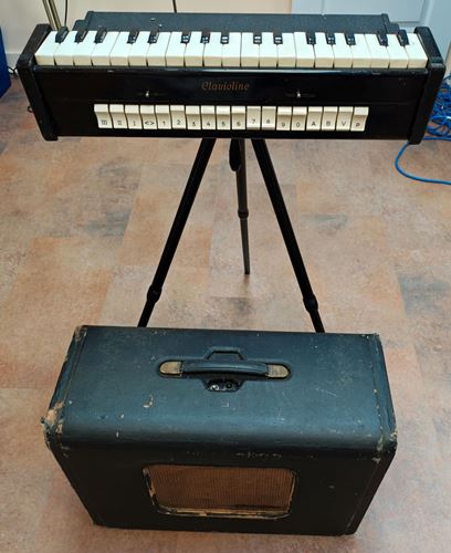 Includes the tube amplifier / speaker, which forms the case that holds the Clavioline, the Clavioline keyboard, 3-legged tripod stand, and power cable with split-off multi-pin cable that powers the Clavioline. Also has the service manual (which appears to be original). And includes the expression knee-lever, which is integral to the sound of the Clavioline.