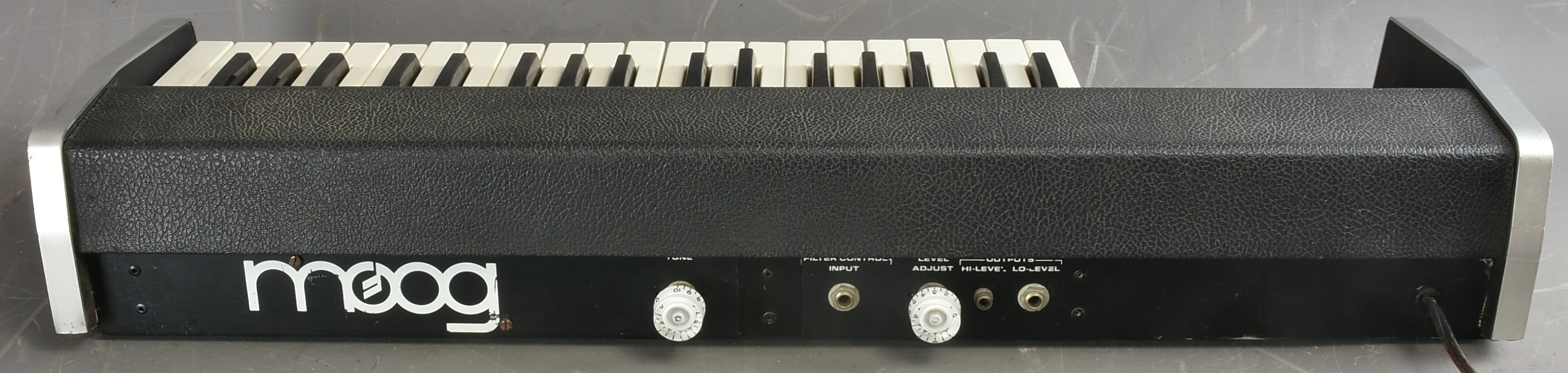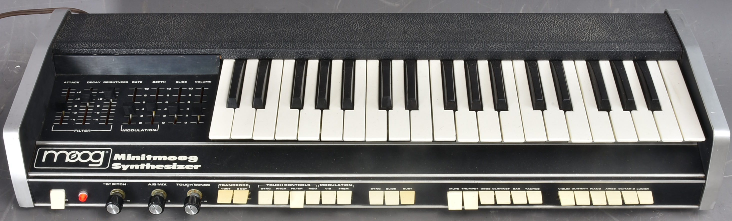 For many years, this was a Moog oddity, collectable because of its rarity, but only occasionally seen in working order. A sort of boosted version of the Satellite - generally considered Moog's worst synth. But hold on - it actually sounds great as well as being the rarest of Moogs. The late Kevin Lightner, who knew more about analogue synths than most people in the world, said this about them: 'a good working Minitmoog can be a joy...... a really fun and expressive player's synth. Not great for sound effects, but excellent for lead lines.' This has just been serviced here (March 2025), including re-bushing, dismantling cleaning and lubricating all sliders pots, etc - sounding very good, playing well: it’s touch response is good, so long as you don’t have the sensitivity control set to wide as it can expose the not too great (nearly 50-year-old) condition of the pressure circuit. But that does work and allow some great control, especially now the keyboard is very nice too. It also has Bob Moog's hand in the design, too - he reportedly had to rescue this project personally after the original team were not succeeding. It is in very nice cosmetic condition as well, although it has to be conceded that the whole cosmetic design is a horrible mishmash. There are three minus points: 1. the slider tops (themselves replacements) are not all in great condition - starting to crack like the originals did. The mains plug (***110V not 220V***) is missing its front capping piece - see photo - and looks very dubiously safe - but I guess that once it is put in the mains supply no live parts are exposed. And having guitar speed knobs for the two pots on the back of the synth is novel. If you want to be convinced this can sound very good, check out Sebastien Moumon's lovely improv on his Minitmoog: https://www.youtube.com/watch?v=Z_TkKRAcluQ Packing 12GBP. |