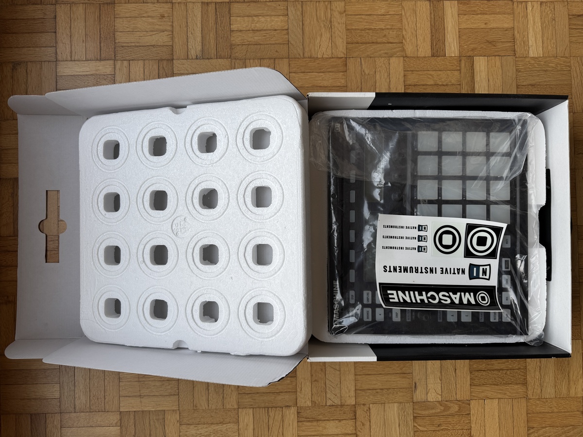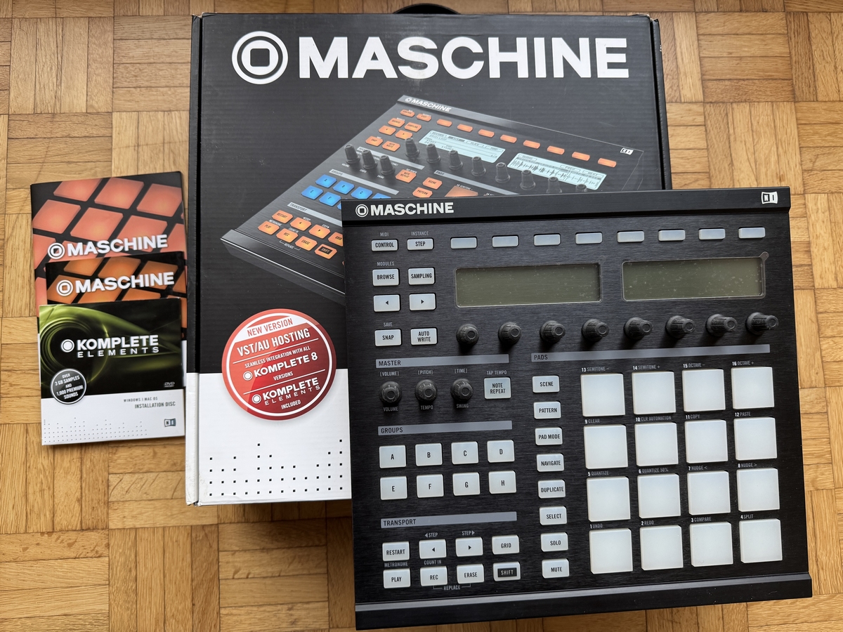 The controller comes in its original box, with the 'Set-Up Guide' booklet, 2 CDs : “Maschine Installation Disc” and “Komplete Elements Installation Disc” and the Native Instruments stickers that came with it. |