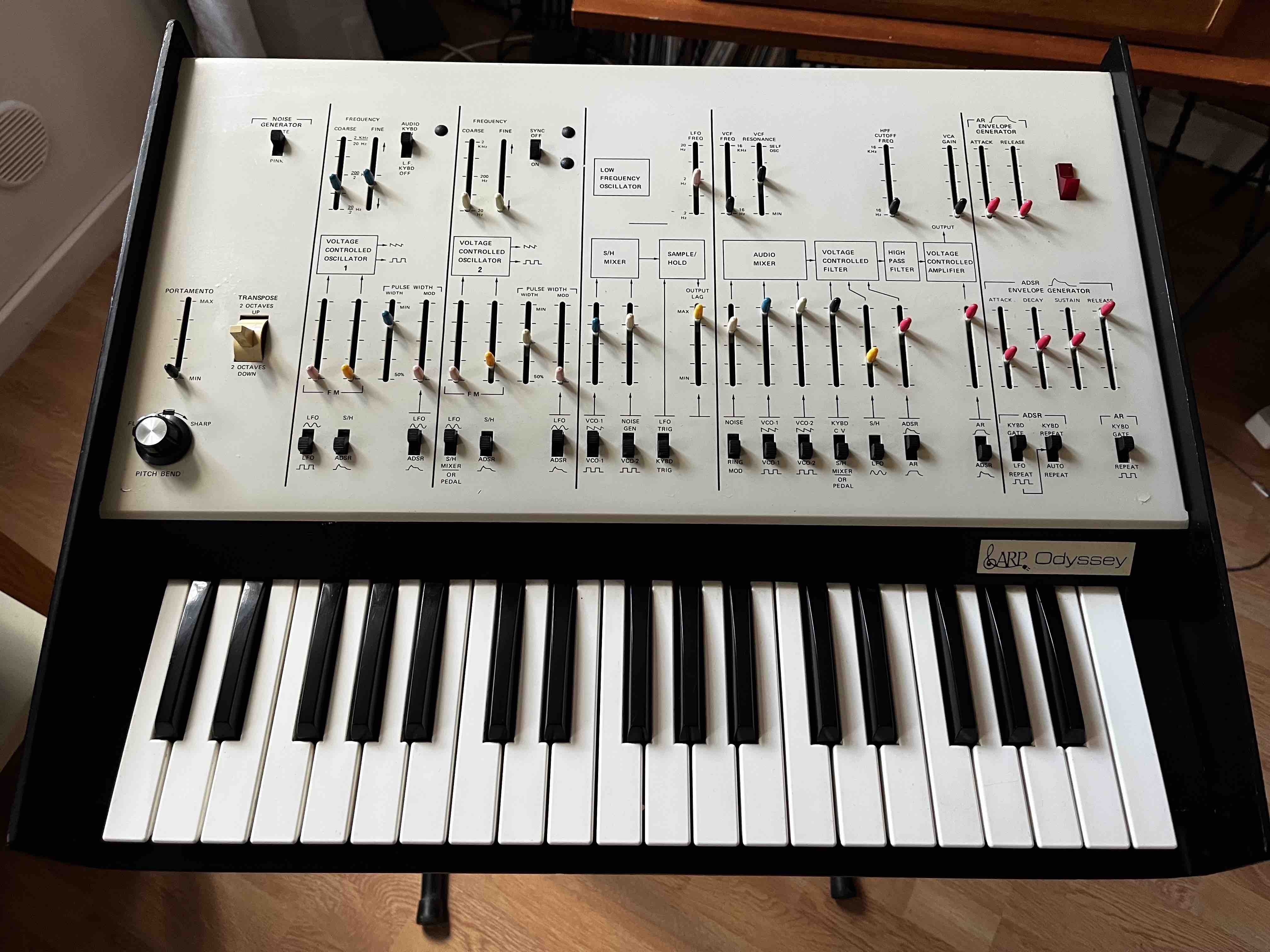 ARP Odyssey model 2800 white face, serial 28422. CV/gate circuit installed, as well as an audio input for passing an external signal through the filter.
