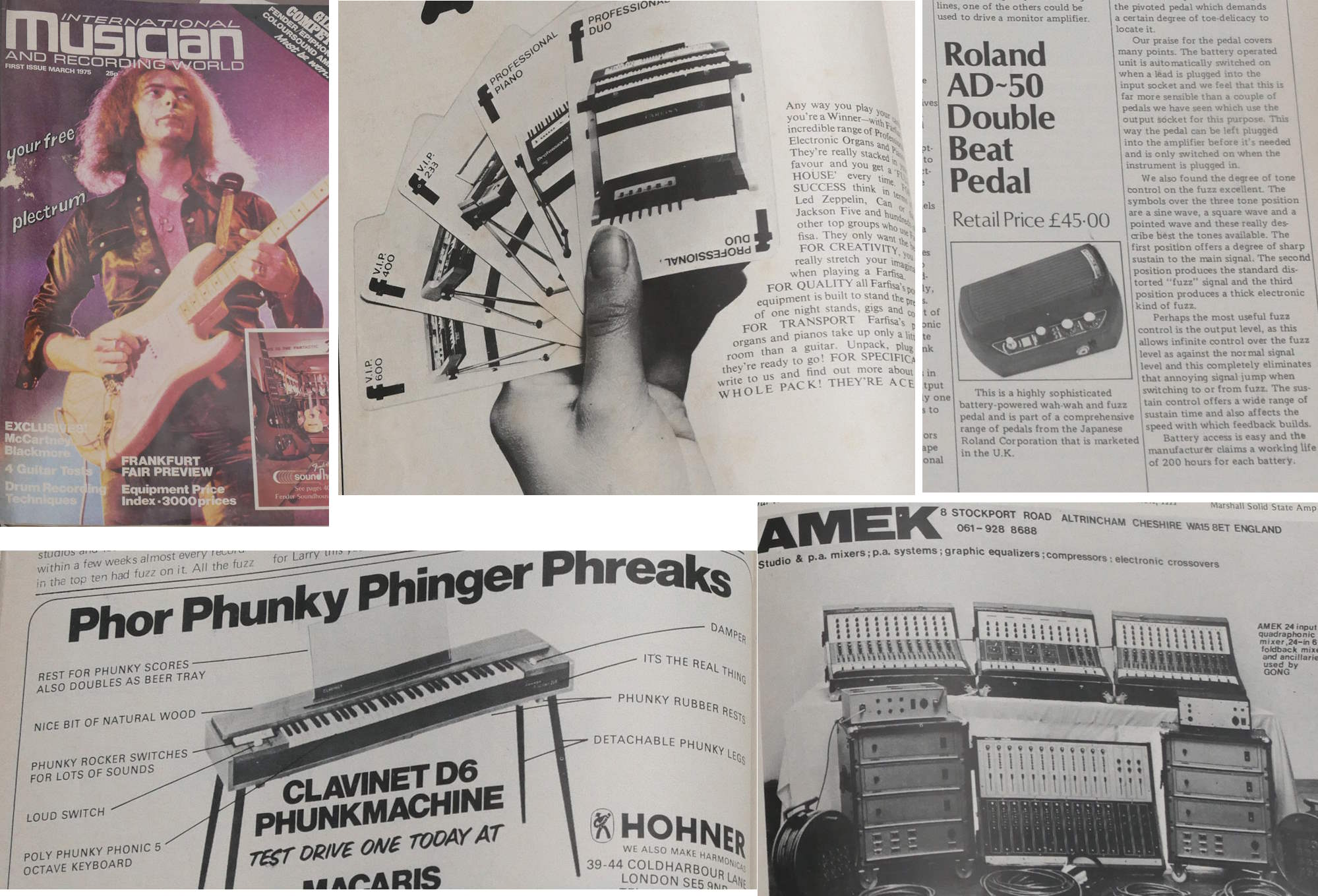 This is a set of International Musician and Recording World magazines in an original optional (and expensive) binder. They are in very good condition, with virtually no notes, or coupons cut out. There is some 'slump' to the pages where they have sat upright in their binder, and probably some dust on top. IM&RW was one of the first magazines produced for the musician and recording studio person. There is a broad range of material covering guitars, amps, keyboards, mics, effects, recording gear, etc.. They were used for research on various books and articles. Please see the photos for an idea of what is included. I've concentrated on synth- and FX-related items in thumbing through taking photos, but there is a lot else of interest. This set dates from the first ever edition (March 75 - over 50 years ago!), and also includes 04, 07, 08, 09, 10, 11 and 12/75 editions. Each set is pretty heavy - weights range from 3kg to over 5kg. Packing is 6GBP for one of these IM&RW sets, but another set bought would then have free packing. |