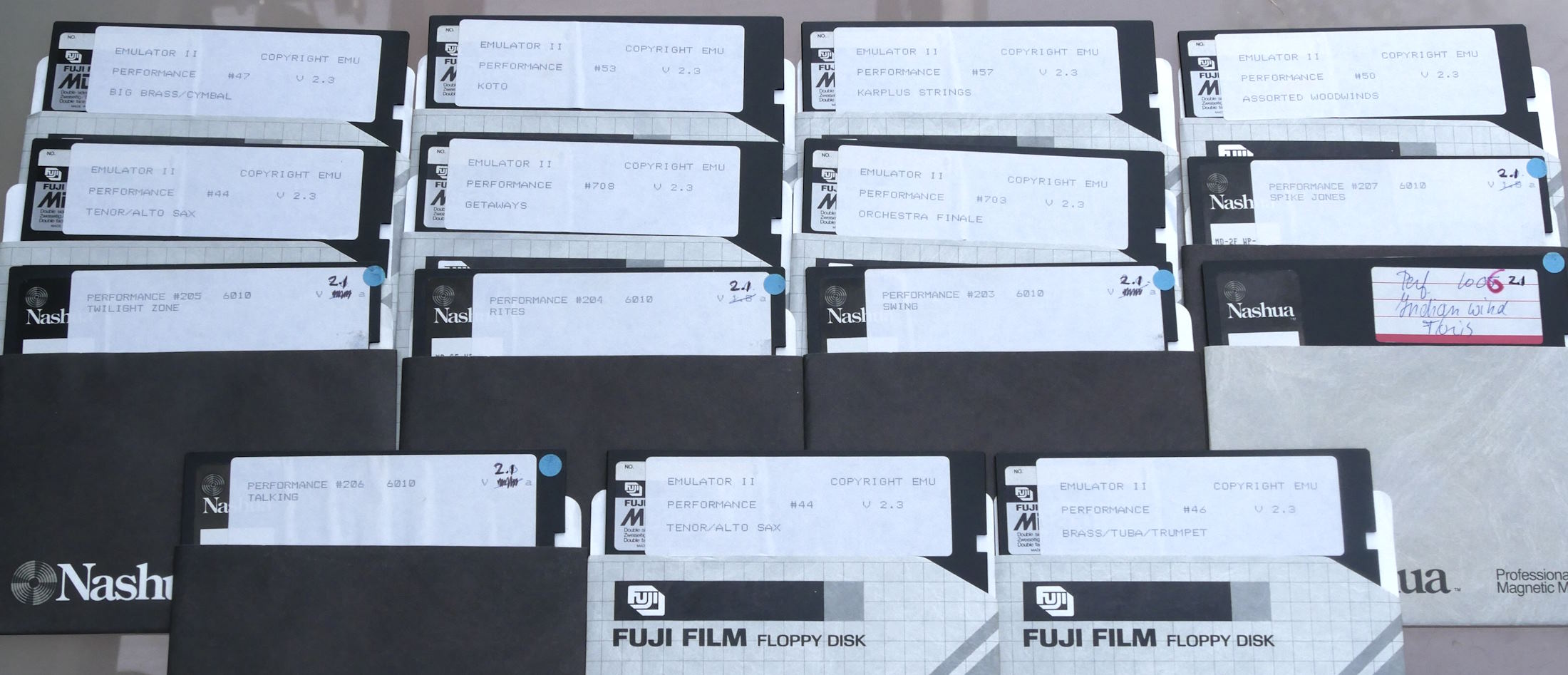 Fourteen E-mu Performance 5 1/4in disks for the Emulator II, plus one home-made. |